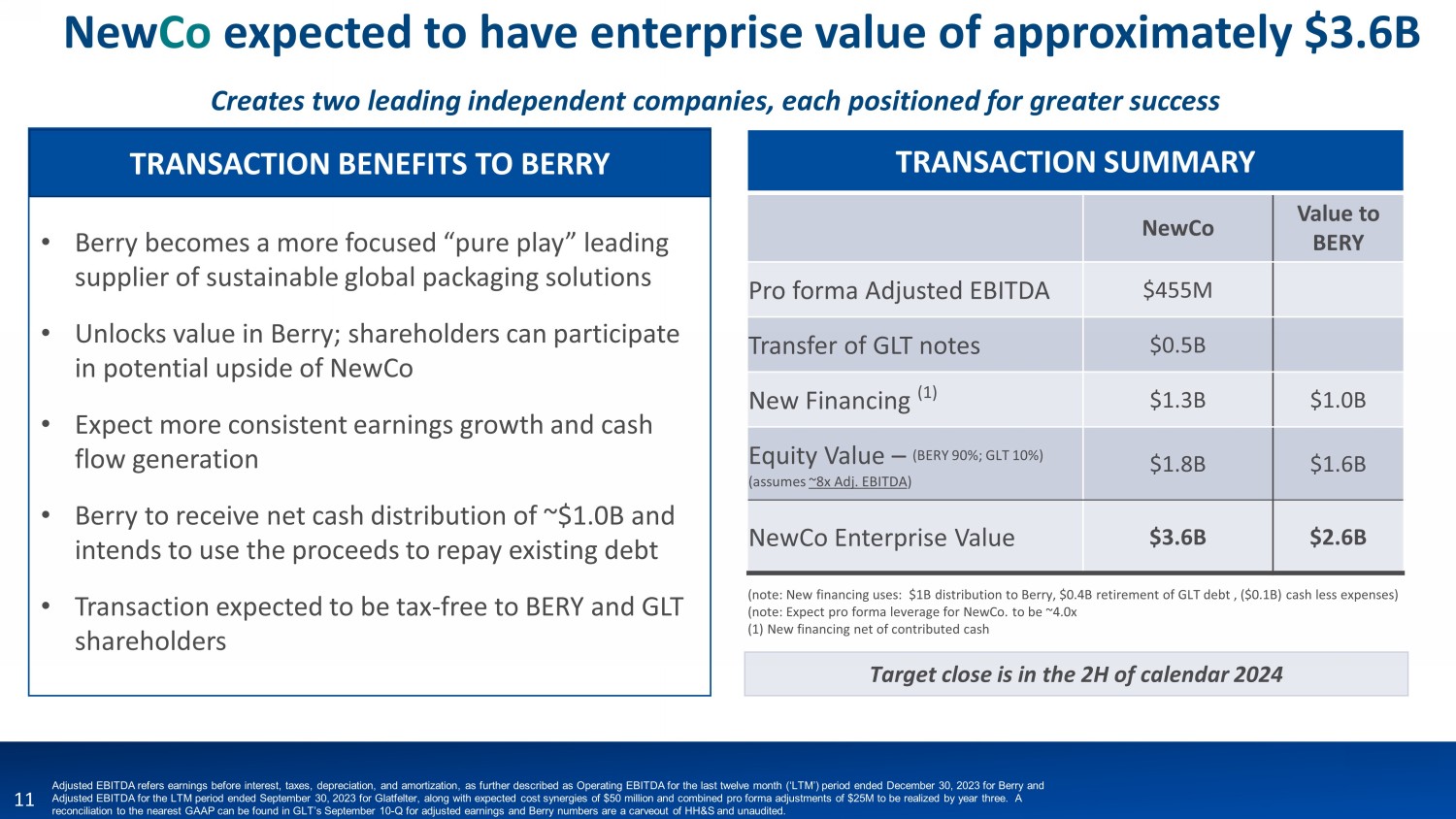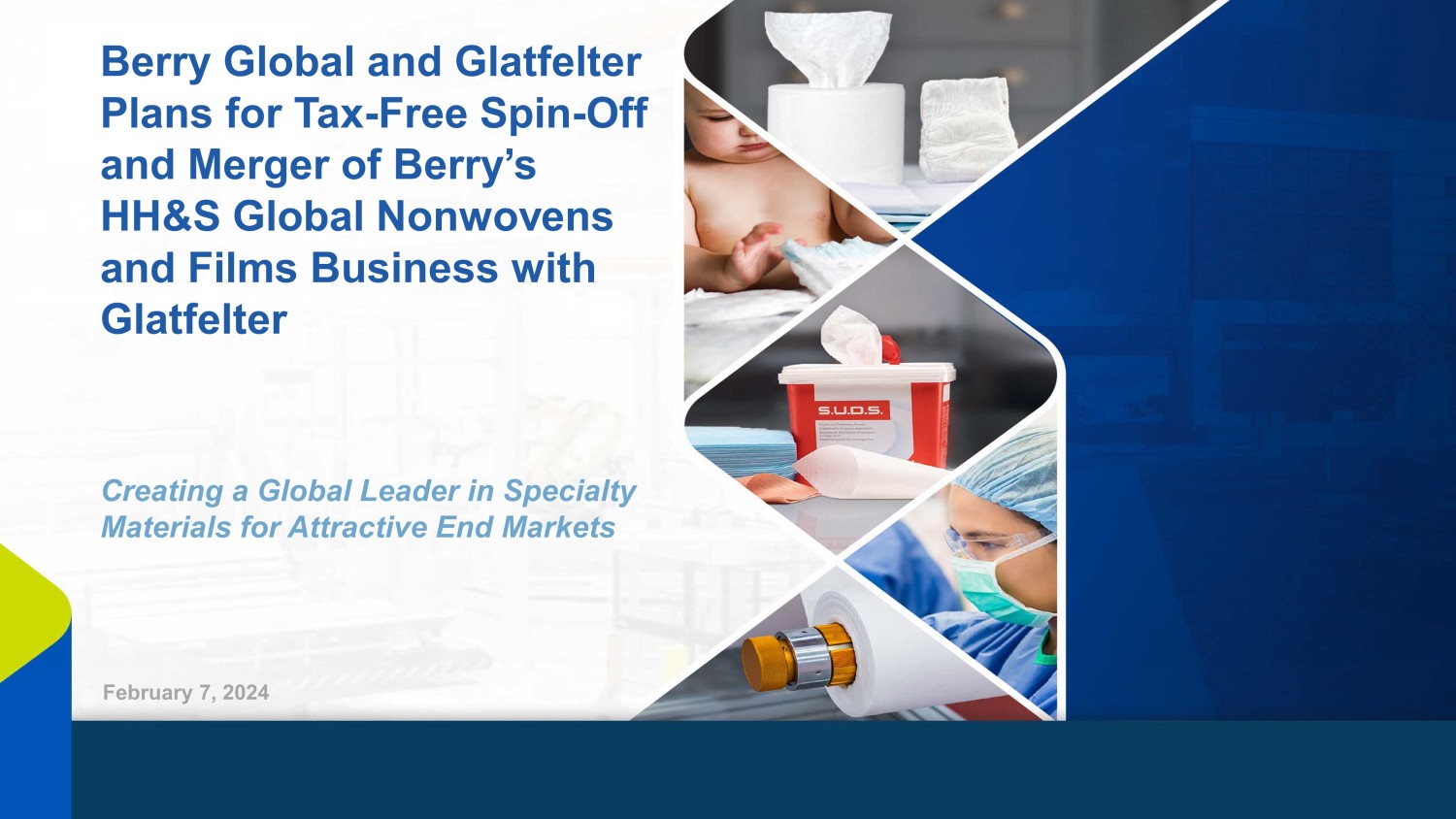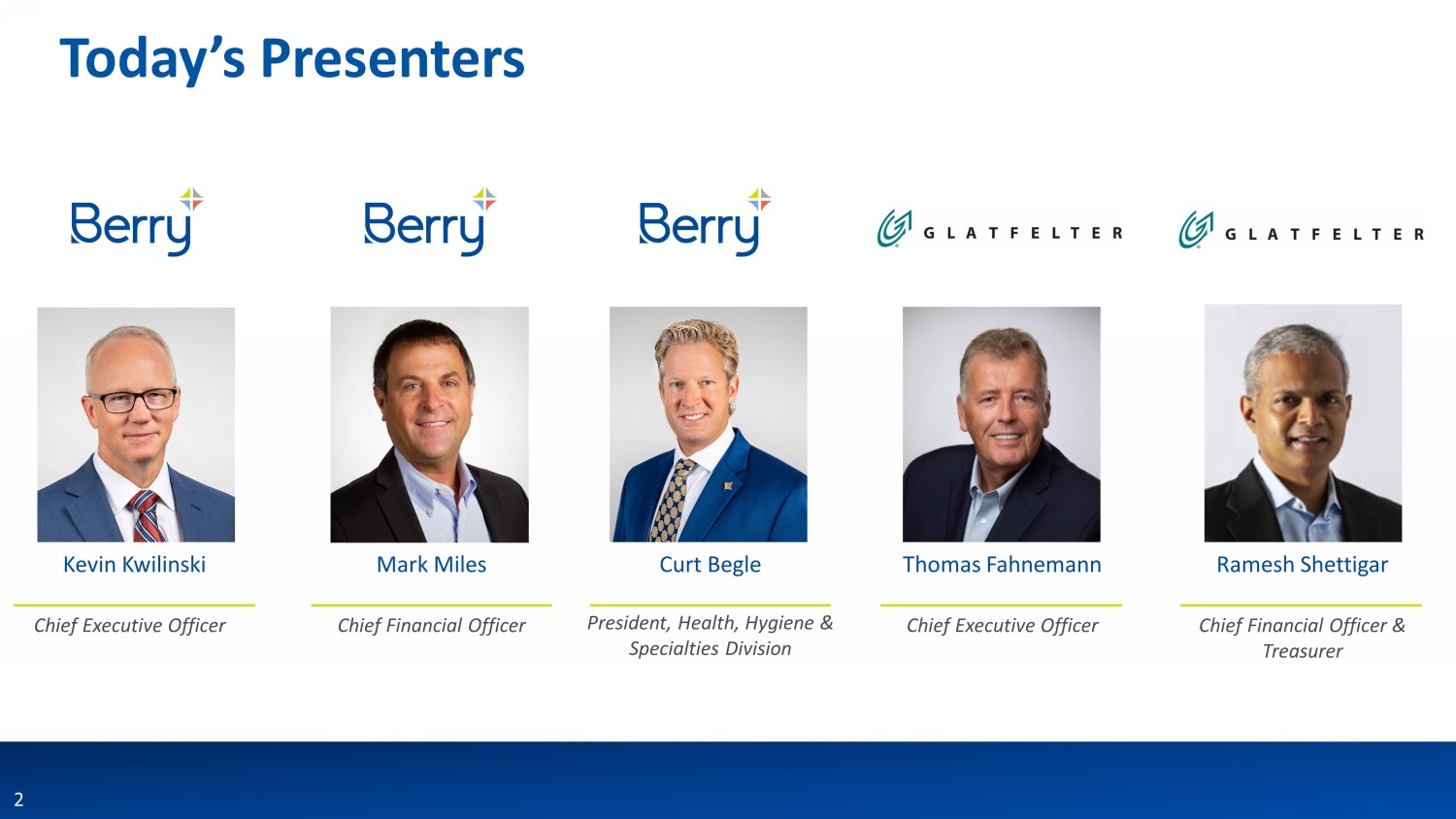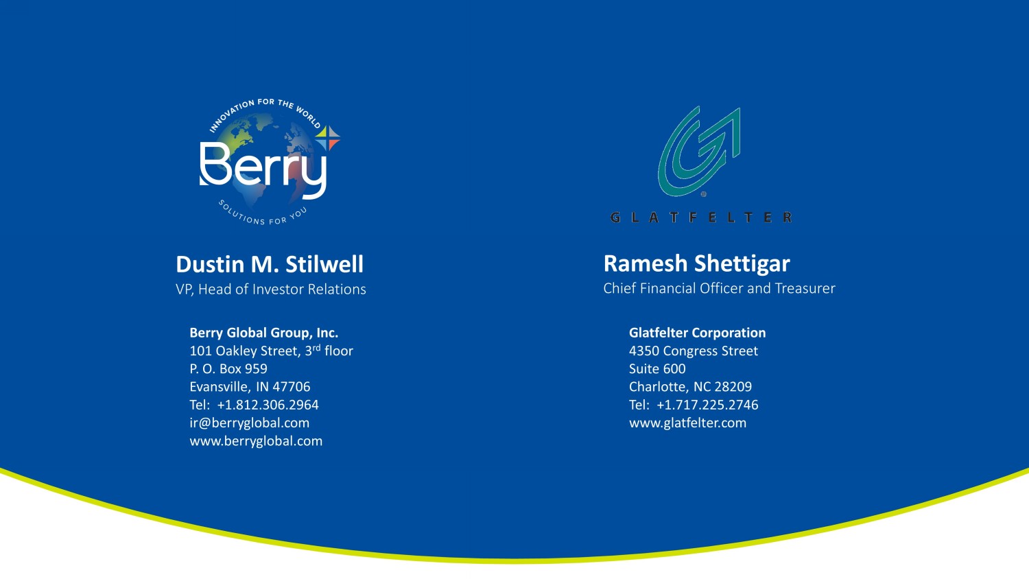 This communication may be deemed to be solicitation material in respect of the proposed transaction between Berry and Glatfelter. In connection with the proposed transaction, Berry and Glatfelter intend to file relevant materials with the SEC, including a registration statement on Form S-4 by Glatfelter that will contain a proxy statement/prospectus relating to the proposed transaction. In addition, Spinco expects to file a registration statement in connection with its separation from Berry. This communication is not a substitute for the registration statements, proxy statement/prospectus or any other document which Berry and/or Glatfelter may file with the SEC. STOCKHOLDERS OF BERRY AND GLATFELTER ARE URGED TO READ ALL RELEVANT DOCUMENTS FILED WITH THE SEC, INCLUDING THE REGISTRATION STATEMENT AND PROXY STATEMENT/PROSPECTUS, BECAUSE THEY WILL CONTAIN IMPORTANT INFORMATION ABOUT THE PROPOSED TRANSACTION. Investors and security holders will be able to obtain copies of the registration statements and proxy statement/prospectus (when available) as well as other filings containing information about Berry and Glatfelter, as well as the Spinco, without charge, at the SEC’s website, http://www.sec.gov. Copies of documents filed with the SEC by Berry or the Spinco will be made available free of charge on Berry’s investor relations website at https://ir.berryglobal.com. Copies of documents filed with the SEC by Glatfelter will be made available free of charge on Glatfelter's investor relations website at https://www.glatfelter.com/investors.