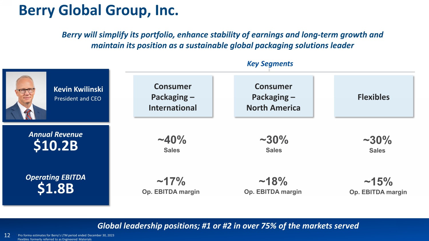 Berry and its directors and executive officers, and Glatfelter and its directors and executive officers, may be deemed to be participants in the solicitation of proxies from the holders of Glatfelter capital stock and/or the offering of securities in respect of the proposed transaction. Information about the directors and executive officers of Berry, including a description of their direct or indirect interests, by security holdings or otherwise, is set forth under the caption “Security Ownership of Beneficial Owners and Management” in the definitive proxy statement for Berry’s 2024 Annual Meeting of Stockholders, which was filed with the SEC on January 4, 2024 (https://www.sec.gov/ixviewer/ix.html?doc=/Archives/edgar/data/0001378992/000110465924001073/tm2325571d6_def14a.htm). Information about the directors and executive officers of Glatfelter including a description of their direct or indirect interests, by security holdings or otherwise, is set forth under the caption “Ownership of Company Stock” in the proxy statement for Glatfelter's 2023 Annual Meeting of Shareholders, which was filed with the SEC on March 31, 2023 (https://www.sec.gov/ixviewer/ix.html?doc=/Archives/edgar/data/0000041719/000004171923000012/glt-20230331.htm). In addition, Curt Begle, the current President of Berry’s Health, Hygiene & Specialties Division, will be appointed as Chief Executive Officer of the combined company. Investors may obtain additional information regarding the interest of such participants by reading the proxy statement/prospectus regarding the proposed transaction when it becomes available.