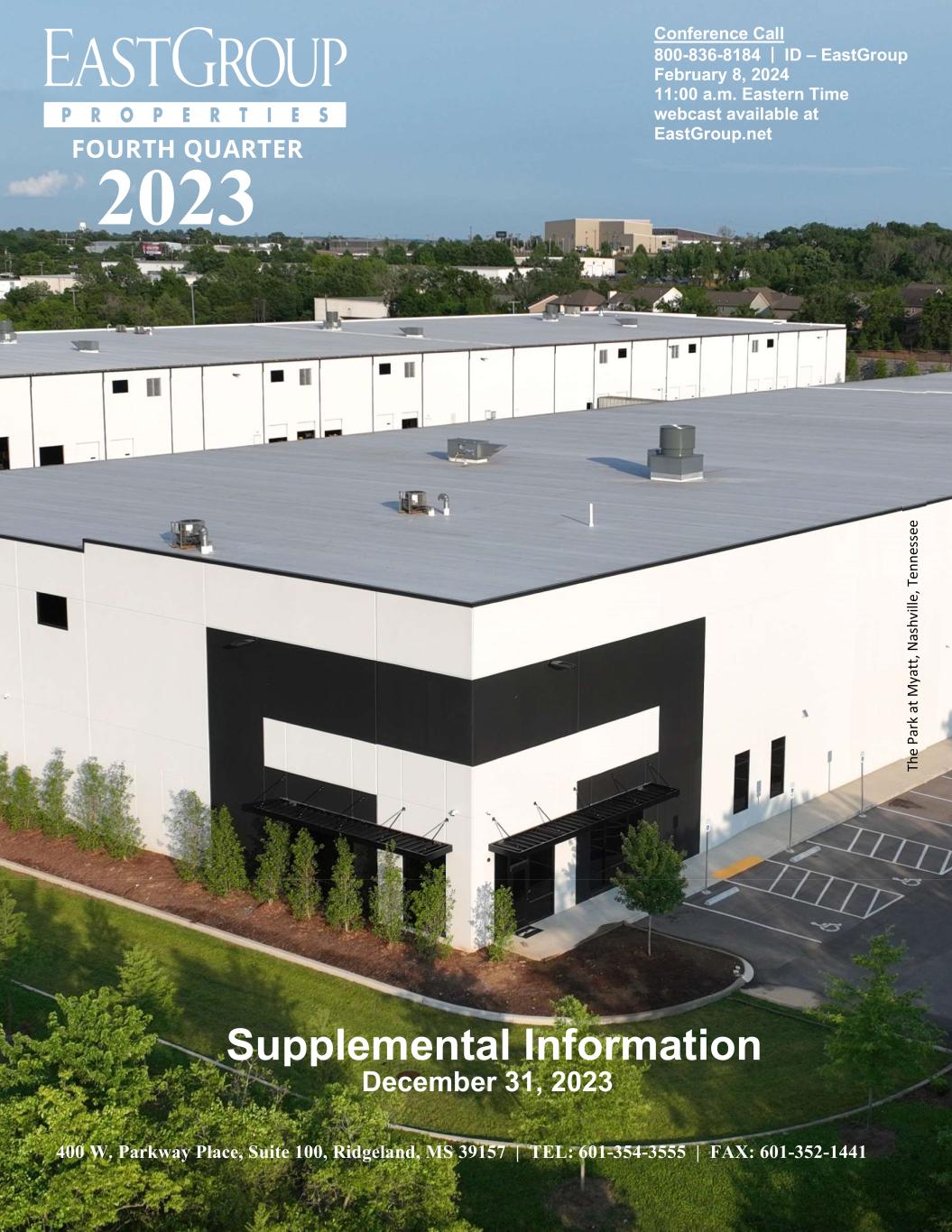400 W. Parkway Place, Suite 100, Ridgeland, MS 39157 | TEL: 601-354-3555 | FAX: 601-352-1441 2023 Supplemental Information FOURTH QUARTER Conference Call 800-836-8184 | ID – EastGroup February 8, 2024 11:00 a.m. Eastern Time webcast available at EastGroup.net December 31, 2023 Th e Pa rk a t M ya tt , N as hv ill e, T en ne ss ee