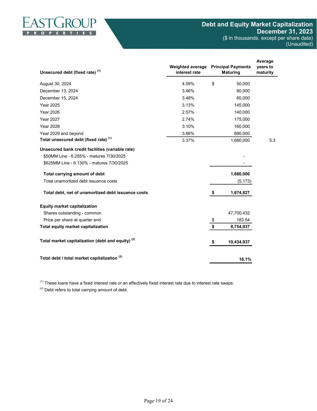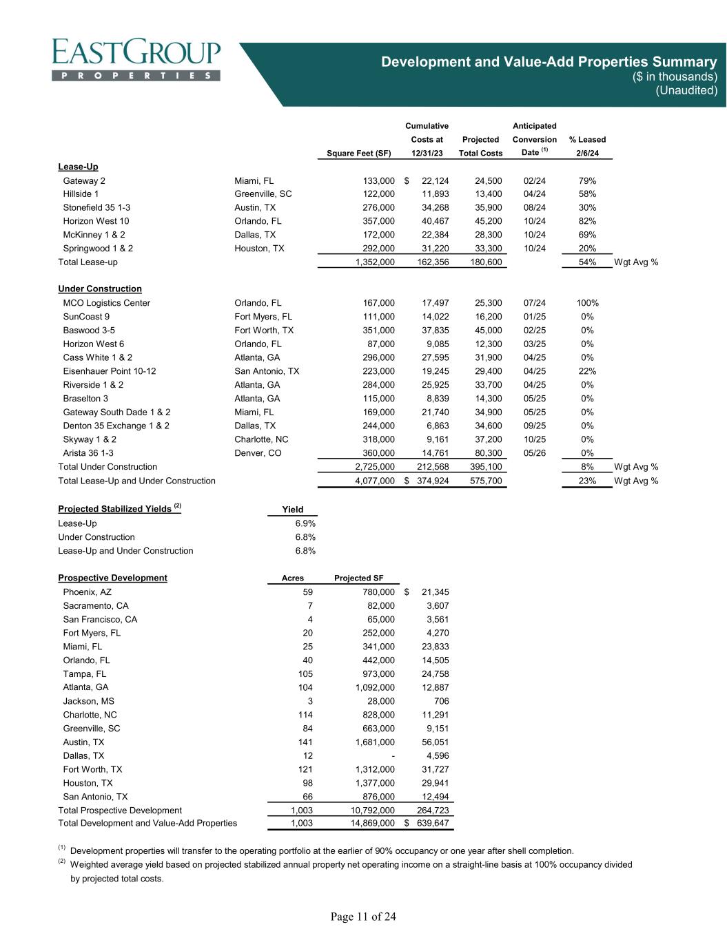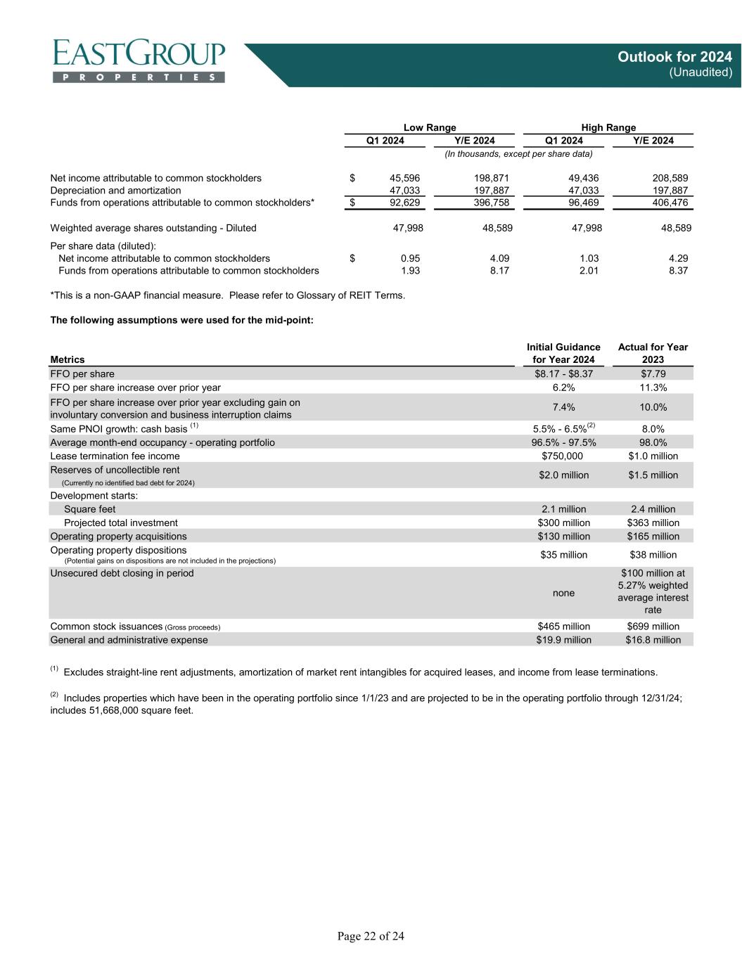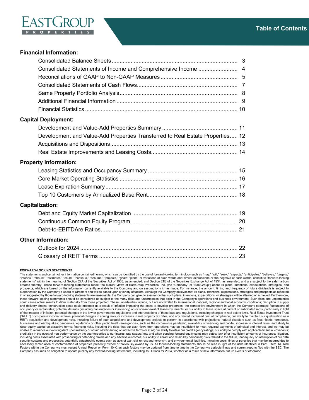 Page 2 of 24 Table of Contents Financial Information: Consolidated Balance Sheets ................................................................................ 3 Consolidated Statements of Income and Comprehensive Income ......................... 4 Reconciliations of GAAP to Non-GAAP Measures ................................................. 5 Consolidated Statements of Cash Flows ................................................................ 7 Same Property Portfolio Analysis ........................................................................... 8 Additional Financial Information ............................................................................. 9 Financial Statistics ................................................................................................. 10 Capital Deployment: Development and Value-Add Properties Summary ................................................ 11 Development and Value-Add Properties Transferred to Real Estate Properties ..... 12 Acquisitions and Dispositions ................................................................................. 13 Real Estate Improvements and Leasing Costs ....................................................... 14 Property Information: Leasing Statistics and Occupancy Summary ......................................................... 15 Core Market Operating Statistics ........................................................................... 16 Lease Expiration Summary .................................................................................... 17 Top 10 Customers by Annualized Base Rent ......................................................... 18 Capitalization: Debt and Equity Market Capitalization ................................................................... 19 Continuous Common Equity Program .................................................................... 20 Debt-to-EBITDAre Ratios ....................................................................................... 21 Other Information: Outlook for 2024 .................................................................................................... 22 Glossary of REIT Terms ........................................................................................ 23 FORWARD-LOOKING STATEMENTS The statements and certain other information contained herein, which can be identified by the use of forward-looking terminology such as “may,” “will,” “seek,” “expects,” “anticipates,” “believes,” “targets,” “intends,” “should,” “estimates,” “could,” “continue,” “assume,” “projects,” “goals” “plans” or variations of such words and similar expressions or the negative of such words, constitute “forward-looking statements” within the meaning of Section 27A of the Securities Act of 1933, as amended, and Section 21E of the Securities Exchange Act of 1934, as amended, and are subject to the safe harbors created thereby. These forward-looking statements reflect the current views of EastGroup Properties, Inc. (the “Company” or “EastGroup”) about its plans, intentions, expectations, strategies, and prospects, which are based on the information currently available to the Company and on assumptions it has made. For instance, the amount, timing and frequency of future dividends is subject to authorization by the Company’s Board of Directors and will be based upon a variety of factors. Although the Company believes that its plans, intentions, expectations, strategies and prospects as reflected in or suggested by those forward-looking statements are reasonable, the Company can give no assurance that such plans, intentions, expectations, or strategies will be attained or achieved. Furthermore, these forward-looking statements should be considered as subject to the many risks and uncertainties that exist in the Company’s operations and business environment. Such risks and uncertainties could cause actual results to differ materially from those projected. These uncertainties include, but are not limited to: international, national, regional and local economic conditions; disruption in supply and delivery chains; construction costs could increase as a result of inflation impacting the costs to develop properties; the competitive environment in which the Company operates; fluctuations of occupancy or rental rates; potential defaults (including bankruptcies or insolvency) on or non-renewal of leases by tenants, or our ability to lease space at current or anticipated rents, particularly in light of the impacts of inflation; potential changes in the law or governmental regulations and interpretations of those laws and regulations, including changes in real estate laws, Real Estate Investment Trust (“REIT”) or corporate income tax laws, potential changes in zoning laws, or increases in real property tax rates, and any related increased cost of compliance; our ability to maintain our qualification as a REIT; acquisition and development risks, including failure of such acquisitions and development projects to perform in accordance with projections; natural disasters such as fires, floods, tornadoes, hurricanes and earthquakes; pandemics, epidemics or other public health emergencies, such as the coronavirus pandemic; availability of financing and capital, increase in interest rates, and ability to raise equity capital on attractive terms; financing risks, including the risks that our cash flows from operations may be insufficient to meet required payments of principal and interest, and we may be unable to refinance our existing debt upon maturity or obtain new financing on attractive terms or at all; our ability to retain our credit agency ratings; our ability to comply with applicable financial covenants; credit risk in the event of non-performance by the counterparties to our interest rate swaps; how and when pending forward equity sales may settle; lack of or insufficient amo