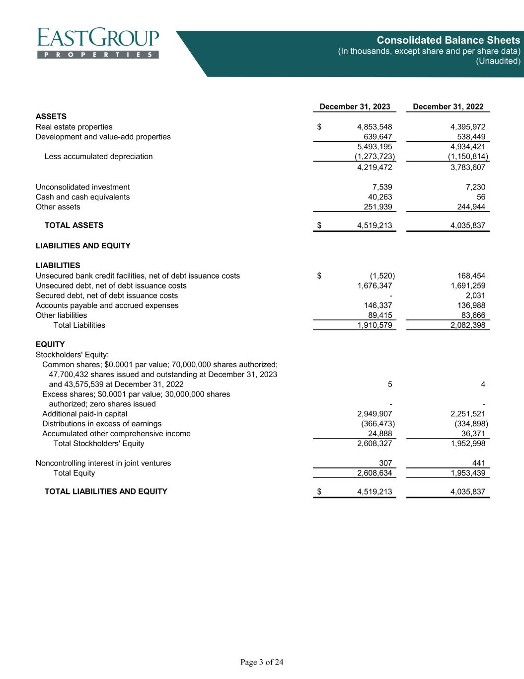 Page 3 of 24 Consolidated Balance Sheets (In thousands, except share and per share data) (Unaudited) December 31, 2023 December 31, 2022 ASSETS Real estate properties 4,853,548$ 4,395,972 Development and value-add properties 639,647 538,449 5,493,195 4,934,421 Less accumulated depreciation (1,273,723) (1,150,814) 4,219,472 3,783,607 Unconsolidated investment 7,539 7,230 Cash and cash equivalents 40,263 56 Other assets 251,939 244,944 TOTAL ASSETS 4,519,213$ 4,035,837 LIABILITIES AND EQUITY LIABILITIES Unsecured bank credit facilities, net of debt issuance costs (1,520)$ 168,454 Unsecured debt, net of debt issuance costs 1,676,347 1,691,259 Secured debt, net of debt issuance costs - 2,031 Accounts payable and accrued expenses 146,337 136,988 Other liabilities 89,415 83,666 Total Liabilities 1,910,579 2,082,398 EQUITY Stockholders' Equity: Common shares; $0.0001 par value; 70,000,000 shares authorized; 47,700,432 shares issued and outstanding at December 31, 2023 and 43,575,539 at December 31, 2022 5 4 Excess shares; $0.0001 par value; 30,000,000 shares authorized; zero shares issued - - Additional paid-in capital 2,949,907 2,251,521 Distributions in excess of earnings (366,473) (334,898) Accumulated other comprehensive income 24,888 36,371 Total Stockholders' Equity 2,608,327 1,952,998 Noncontrolling interest in joint ventures 307 441 Total Equity 2,608,634 1,953,439 TOTAL LIABILITIES AND EQUITY 4,519,213$ 4,035,837