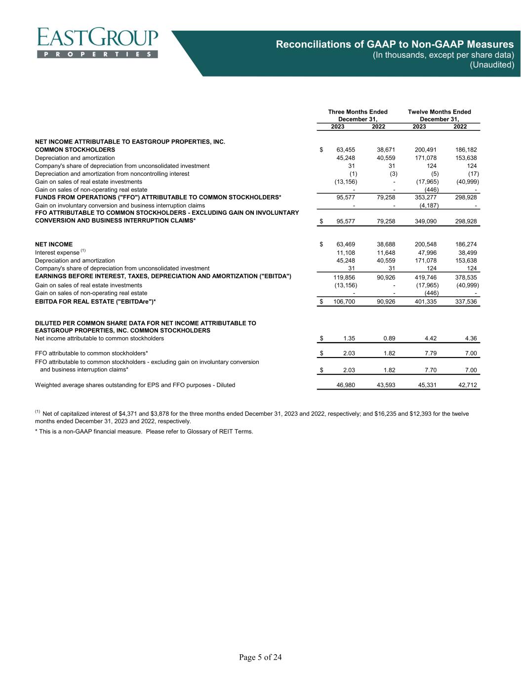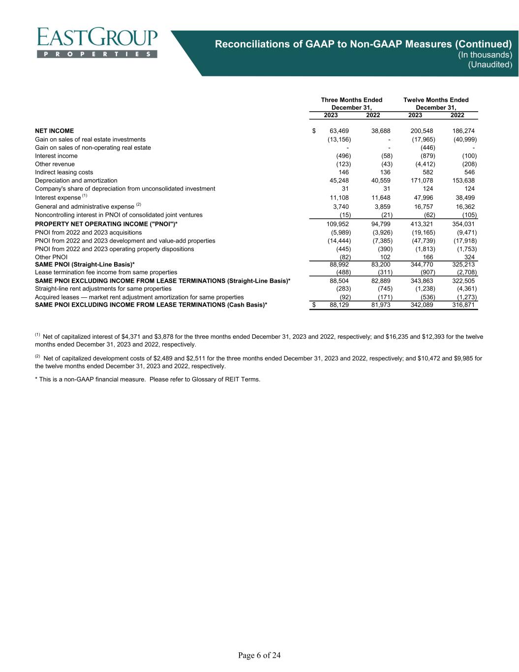 Page 5 of 24 Reconciliations of GAAP to Non-GAAP Measures (In thousands, except per share data) (Unaudited) 2023 2022 2023 2022 NET INCOME ATTRIBUTABLE TO EASTGROUP PROPERTIES, INC. COMMON STOCKHOLDERS 63,455$ 38,671 200,491 186,182 Depreciation and amortization 45,248 40,559 171,078 153,638 Company's share of depreciation from unconsolidated investment 31 31 124 124 Depreciation and amortization from noncontrolling interest (1) (3) (5) (17) Gain on sales of real estate investments (13,156) - (17,965) (40,999) Gain on sales of non-operating real estate - - (446) - FUNDS FROM OPERATIONS ("FFO") ATTRIBUTABLE TO COMMON STOCKHOLDERS* 95,577 79,258 353,277 298,928 Gain on involuntary conversion and business interruption claims - - (4,187) - FFO ATTRIBUTABLE TO COMMON STOCKHOLDERS - EXCLUDING GAIN ON INVOLUNTARY CONVERSION AND BUSINESS INTERRUPTION CLAIMS* 95,577$ 79,258 349,090 298,928 NET INCOME 63,469$ 38,688 200,548 186,274 Interest expense (1) 11,108 11,648 47,996 38,499 Depreciation and amortization 45,248 40,559 171,078 153,638 Company's share of depreciation from unconsolidated investment 31 31 124 124 EARNINGS BEFORE INTEREST, TAXES, DEPRECIATION AND AMORTIZATION ("EBITDA") 119,856 90,926 419,746 378,535 Gain on sales of real estate investments (13,156) - (17,965) (40,999) Gain on sales of non-operating real estate - - (446) - EBITDA FOR REAL ESTATE ("EBITDAre")* 106,700$ 90,926 401,335 337,536 DILUTED PER COMMON SHARE DATA FOR NET INCOME ATTRIBUTABLE TO EASTGROUP PROPERTIES, INC. COMMON STOCKHOLDERS Net income attributable to common stockholders 1.35$ 0.89 4.42 4.36 FFO attributable to common stockholders* 2.03$ 1.82 7.79 7.00 FFO attributable to common stockholders - excluding gain on involuntary conversion and business interruption claims* 2.03$ 1.82 7.70 7.00 Weighted average shares outstanding for EPS and FFO purposes - Diluted 46,980 43,593 45,331 42,712 December 31, * This is a non-GAAP financial measure. Please refer to Glossary of REIT Terms. Three Months Ended December 31, Twelve Months Ended (1) Net of capitalized interest of $4,371 and $3,878 for the three months ended December 31, 2023 and 2022, respectively; and $16,235 and $12,393 for the twelve months ended December 31, 2023 and 2022, respectively.