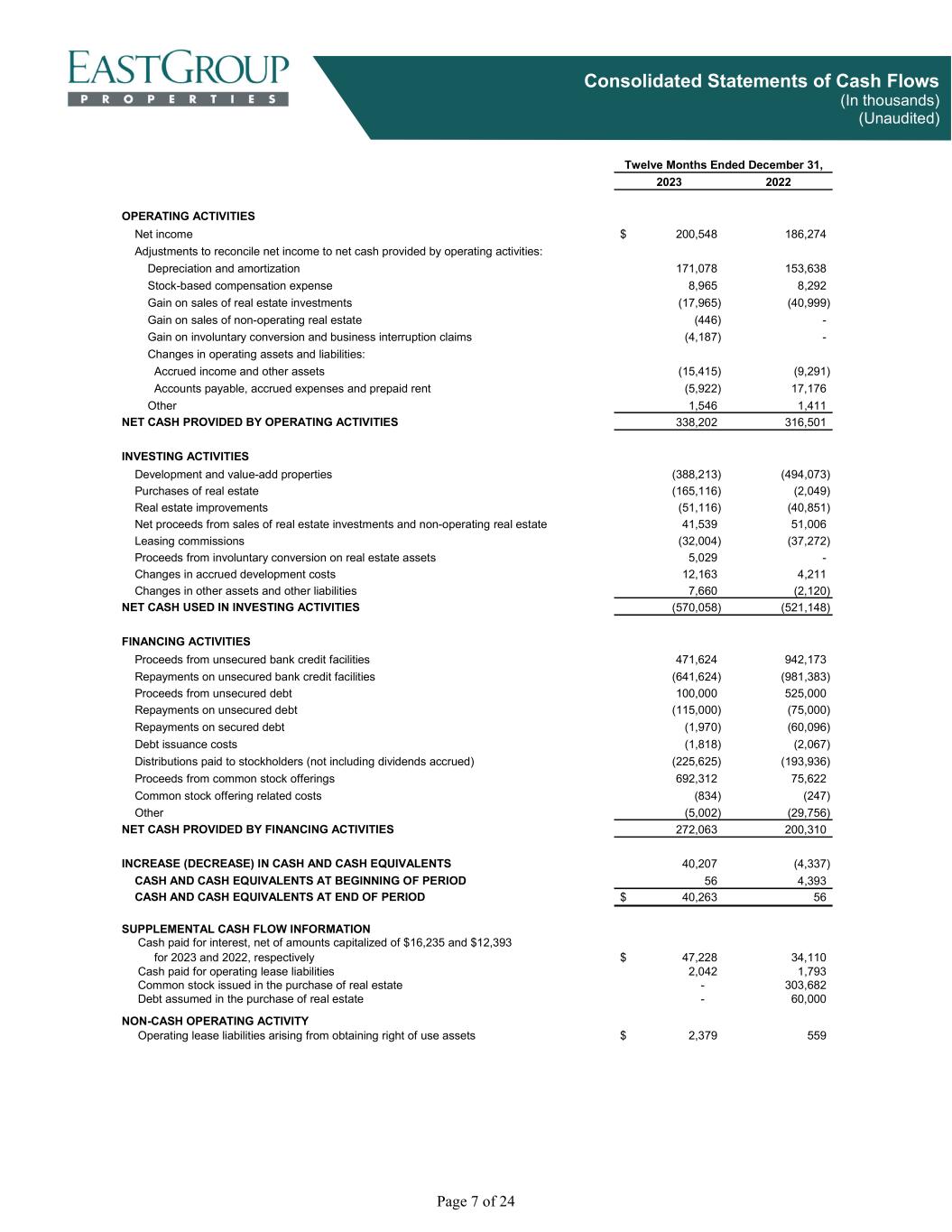 Page 7 of 24 Consolidated Statements of Cash Flows (In thousands) (Unaudited) 2023 2022 OPERATING ACTIVITIES Net income 200,548$ 186,274 Adjustments to reconcile net income to net cash provided by operating activities: Depreciation and amortization 171,078 153,638 Stock-based compensation expense 8,965 8,292 Gain on sales of real estate investments (17,965) (40,999) Gain on sales of non-operating real estate (446) - Gain on involuntary conversion and business interruption claims (4,187) - Changes in operating assets and liabilities: Accrued income and other assets (15,415) (9,291) Accounts payable, accrued expenses and prepaid rent (5,922) 17,176 Other 1,546 1,411 NET CASH PROVIDED BY OPERATING ACTIVITIES 338,202 316,501 INVESTING ACTIVITIES Development and value-add properties (388,213) (494,073) Purchases of real estate (165,116) (2,049) Real estate improvements (51,116) (40,851) Net proceeds from sales of real estate investments and non-operating real estate 41,539 51,006 Leasing commissions (32,004) (37,272) Proceeds from involuntary conversion on real estate assets 5,029 - Changes in accrued development costs 12,163 4,211 Changes in other assets and other liabilities 7,660 (2,120) NET CASH USED IN INVESTING ACTIVITIES (570,058) (521,148) FINANCING ACTIVITIES Proceeds from unsecured bank credit facilities 471,624 942,173 Repayments on unsecured bank credit facilities (641,624) (981,383) Proceeds from unsecured debt 100,000 525,000 Repayments on unsecured debt (115,000) (75,000) Repayments on secured debt (1,970) (60,096) Debt issuance costs (1,818) (2,067) Distributions paid to stockholders (not including dividends accrued) (225,625) (193,936) Proceeds from common stock offerings 692,312 75,622 Common stock offering related costs (834) (247) Other (5,002) (29,756) NET CASH PROVIDED BY FINANCING ACTIVITIES 272,063 200,310 INCREASE (DECREASE) IN CASH AND CASH EQUIVALENTS 40,207 (4,337) CASH AND CASH EQUIVALENTS AT BEGINNING OF PERIOD 56 4,393 CASH AND CASH EQUIVALENTS AT END OF PERIOD 40,263$ 56 SUPPLEMENTAL CASH FLOW INFORMATION Cash paid for interest, net of amounts capitalized of $16,235 and $12,393 for 2023 and 2022, respectively 47,228$ 34,110 Cash paid for operating lease liabilities 2,042 1,793 Common stock issued in the purchase of real estate - 303,682 Debt assumed in the purchase of real estate - 60,000 NON-CASH OPERATING ACTIVITY Operating lease liabilities arising from obtaining right of use assets 2,379$ 559 Twelve Months Ended December 31,