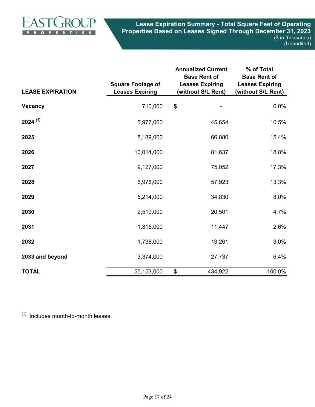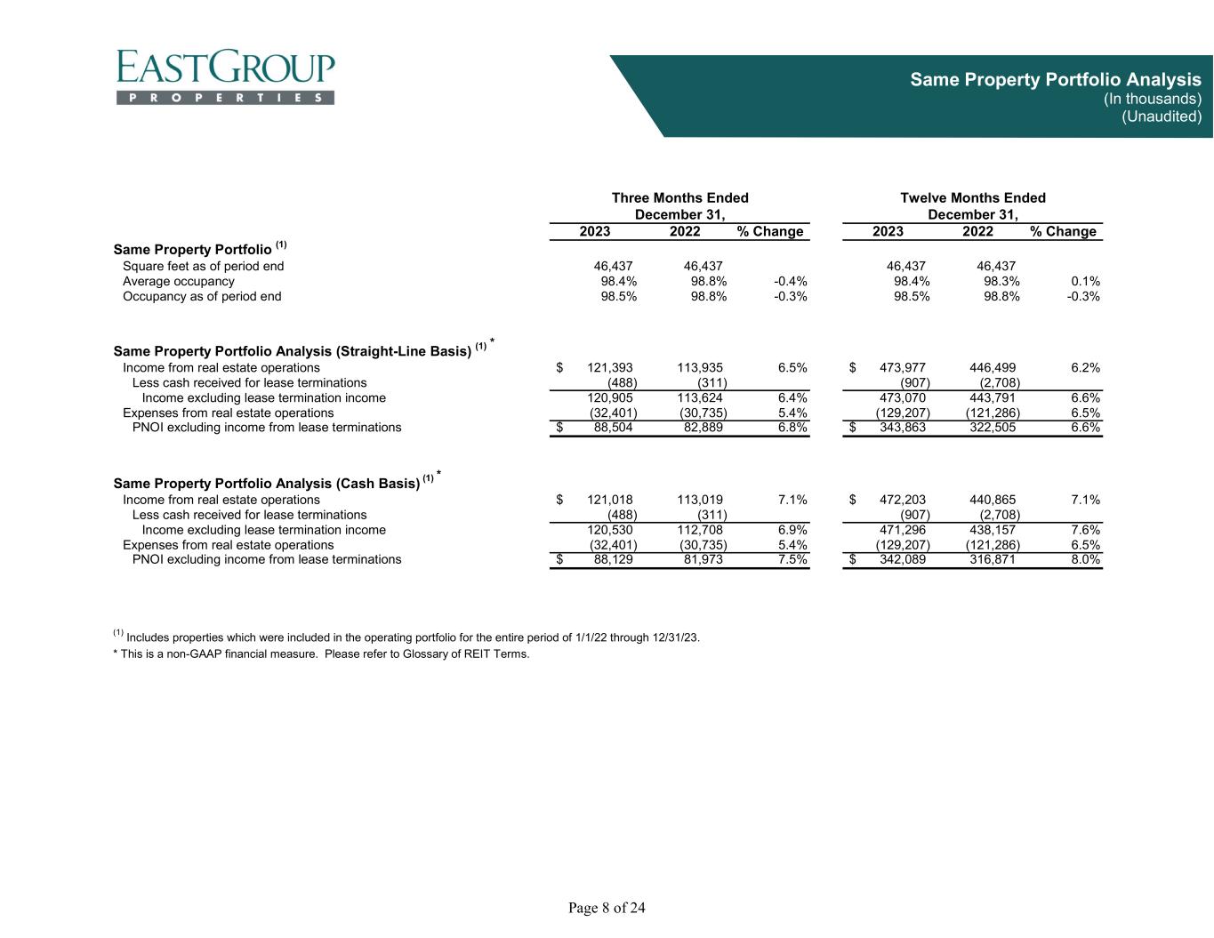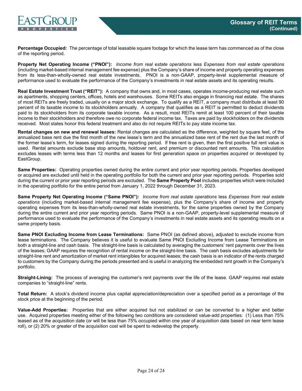 Page 24 of 24 Glossary of REIT Terms (Continued) Percentage Occupied: The percentage of total leasable square footage for which the lease term has commenced as of the close of the reporting period. Property Net Operating Income (“PNOI”): Income from real estate operations less Expenses from real estate operations (including market-based internal management fee expense) plus the Company’s share of income and property operating expenses from its less-than-wholly-owned real estate investments. PNOI is a non-GAAP, property-level supplemental measure of performance used to evaluate the performance of the Company’s investments in real estate assets and its operating results. Real Estate Investment Trust (“REIT”): A company that owns and, in most cases, operates income-producing real estate such as apartments, shopping centers, offices, hotels and warehouses. Some REITs also engage in financing real estate. The shares of most REITs are freely traded, usually on a major stock exchange. To qualify as a REIT, a company must distribute at least 90 percent of its taxable income to its stockholders annually. A company that qualifies as a REIT is permitted to deduct dividends paid to its stockholders from its corporate taxable income. As a result, most REITs remit at least 100 percent of their taxable income to their stockholders and therefore owe no corporate federal income tax. Taxes are paid by stockholders on the dividends received. Most states honor this federal treatment and also do not require REITs to pay state income tax. Rental changes on new and renewal leases: Rental changes are calculated as the difference, weighted by square feet, of the annualized base rent due the first month of the new lease’s term and the annualized base rent of the rent due the last month of the former lease’s term, for leases signed during the reporting period. If free rent is given, then the first positive full rent value is used. Rental amounts exclude base stop amounts, holdover rent, and premium or discounted rent amounts. This calculation excludes leases with terms less than 12 months and leases for first generation space on properties acquired or developed by EastGroup. Same Properties: Operating properties owned during the entire current and prior year reporting periods. Properties developed or acquired are excluded until held in the operating portfolio for both the current and prior year reporting periods. Properties sold during the current or prior year reporting periods are excluded. The Same Property Pool includes properties which were included in the operating portfolio for the entire period from January 1, 2022 through December 31, 2023. Same Property Net Operating Income (“Same PNOI”): Income from real estate operations less Expenses from real estate operations (including market-based internal management fee expense), plus the Company’s share of income and property operating expenses from its less-than-wholly-owned real estate investments, for the same properties owned by the Company during the entire current and prior year reporting periods. Same PNOI is a non-GAAP, property-level supplemental measure of performance used to evaluate the performance of the Company’s investments in real estate assets and its operating results on a same property basis. Same PNOI Excluding Income from Lease Terminations: Same PNOI (as defined above), adjusted to exclude income from lease terminations. The Company believes it is useful to evaluate Same PNOI Excluding Income from Lease Terminations on both a straight-line and cash basis. The straight-line basis is calculated by averaging the customers’ rent payments over the lives of the leases; GAAP requires the recognition of rental income on the straight-line basis. The cash basis excludes adjustments for straight-line rent and amortization of market rent intangibles for acquired leases; the cash basis is an indicator of the rents charged to customers by the Company during the periods presented and is useful in analyzing the embedded rent growth in the Company’s portfolio. Straight-Lining: The process of averaging the customer’s rent payments over the life of the lease. GAAP requires real estate companies to “straight-line” rents. Total Return: A stock’s dividend income plus capital appreciation/depreciation over a specified period as a percentage of the stock price at the beginning of the period. Value-Add Properties: Properties that are either acquired but not stabilized or can be converted to a higher and better use. Acquired properties meeting either of the following two conditions are considered value-add properties: (1) Less than 75% leased as of the acquisition date (or will be less than 75% occupied within one year of acquisition date based on near term lease roll), or (2) 20% or greater of the acquisition cost will be spent to redevelop the property.