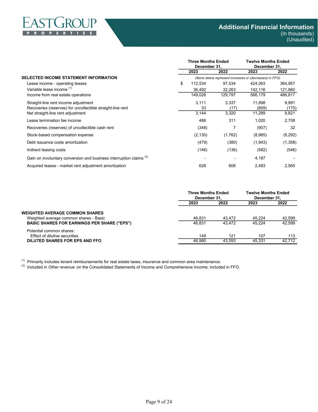 Page 9 of 24 Additional Financial Information (In thousands) (Unaudited) 2023 2022 2023 2022 Lease income - operating leases 112,534$ 97,534 424,063 364,957 Variable lease income (1) 36,492 32,263 142,116 121,860 Income from real estate operations 149,026 129,797 566,179 486,817 Straight-line rent income adjustment 3,111 3,337 11,898 9,991 Recoveries (reserves) for uncollectible straight-line rent 33 (17) (609) (170) Net straight-line rent adjustment 3,144 3,320 11,289 9,821 Lease termination fee income 488 311 1,020 2,708 Recoveries (reserves) of uncollectible cash rent (348) 7 (907) 32 Stock-based compensation expense (2,130) (1,762) (8,965) (8,292) Debt issuance costs amortization (479) (380) (1,943) (1,358) Indirect leasing costs (146) (136) (582) (546) Gain on involuntary conversion and business interruption claims (2) - - 4,187 - Acquired leases - market rent adjustment amortization 628 608 2,483 2,565 2023 2022 2023 2022 WEIGHTED AVERAGE COMMON SHARES Weighted average common shares - Basic 46,831 43,472 45,224 42,599 BASIC SHARES FOR EARNINGS PER SHARE ("EPS") 46,831 43,472 45,224 42,599 Potential common shares: Effect of dilutive securities 149 121 107 113 DILUTED SHARES FOR EPS AND FFO 46,980 43,593 45,331 42,712 (1) Primarily includes tenant reimbursements for real estate taxes, insurance and common area maintenance. (2) Included in Other revenue on the Consolidated Statements of Income and Comprehensive Income; included in FFO. (Items below represent increases or (decreases) in FFO) December 31, Three Months Ended Three Months Ended December 31, Twelve Months Ended December 31, Twelve Months Ended December 31, SELECTED INCOME STATEMENT INFORMATION