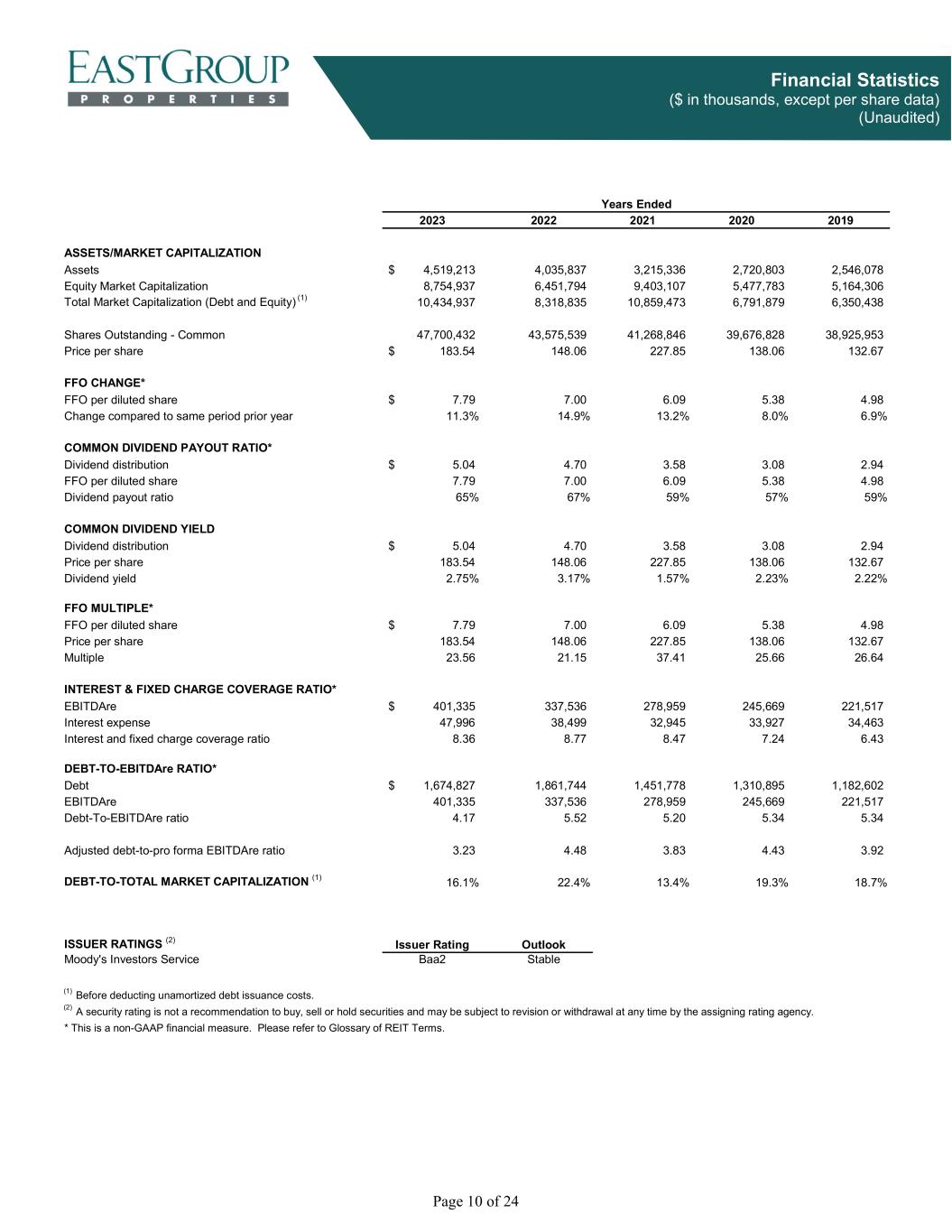 Page 10 of 24 Financial Statistics ($ in thousands, except per share data) (Unaudited) 2023 2022 2021 2020 2019 ASSETS/MARKET CAPITALIZATION Assets 4,519,213$ 4,035,837 3,215,336 2,720,803 2,546,078 Equity Market Capitalization 8,754,937 6,451,794 9,403,107 5,477,783 5,164,306 Total Market Capitalization (Debt and Equity) (1) 10,434,937 8,318,835 10,859,473 6,791,879 6,350,438 Shares Outstanding - Common 47,700,432 43,575,539 41,268,846 39,676,828 38,925,953 Price per share 183.54$ 148.06 227.85 138.06 132.67 FFO CHANGE* FFO per diluted share 7.79$ 7.00 6.09 5.38 4.98 Change compared to same period prior year 11.3% 14.9% 13.2% 8.0% 6.9% COMMON DIVIDEND PAYOUT RATIO* Dividend distribution 5.04$ 4.70 3.58 3.08 2.94 FFO per diluted share 7.79 7.00 6.09 5.38 4.98 Dividend payout ratio 65% 67% 59% 57% 59% COMMON DIVIDEND YIELD Dividend distribution 5.04$ 4.70 3.58 3.08 2.94 Price per share 183.54 148.06 227.85 138.06 132.67 Dividend yield 2.75% 3.17% 1.57% 2.23% 2.22% FFO MULTIPLE* FFO per diluted share 7.79$ 7.00 6.09 5.38 4.98 Price per share 183.54 148.06 227.85 138.06 132.67 Multiple 23.56 21.15 37.41 25.66 26.64 INTEREST & FIXED CHARGE COVERAGE RATIO* EBITDAre 401,335$ 337,536 278,959 245,669 221,517 Interest expense 47,996 38,499 32,945 33,927 34,463 Interest and fixed charge coverage ratio 8.36 8.77 8.47 7.24 6.43 DEBT-TO-EBITDAre RATIO* Debt 1,674,827$ 1,861,744 1,451,778 1,310,895 1,182,602 EBITDAre 401,335 337,536 278,959 245,669 221,517 Debt-To-EBITDAre ratio 4.17 5.52 5.20 5.34 5.34 Adjusted debt-to-pro forma EBITDAre ratio 3.23 4.48 3.83 4.43 3.92 DEBT-TO-TOTAL MARKET CAPITALIZATION (1) 16.1% 22.4% 13.4% 19.3% 18.7% ISSUER RATINGS (2) Issuer Rating Outlook Moody's Investors Service Baa2 Stable (1) Before deducting unamortized debt issuance costs. (2) A security rating is not a recommendation to buy, sell or hold securities and may be subject to revision or withdrawal at any time by the assigning rating agency. * This is a non-GAAP financial measure. Please refer to Glossary of REIT Terms. Years Ended