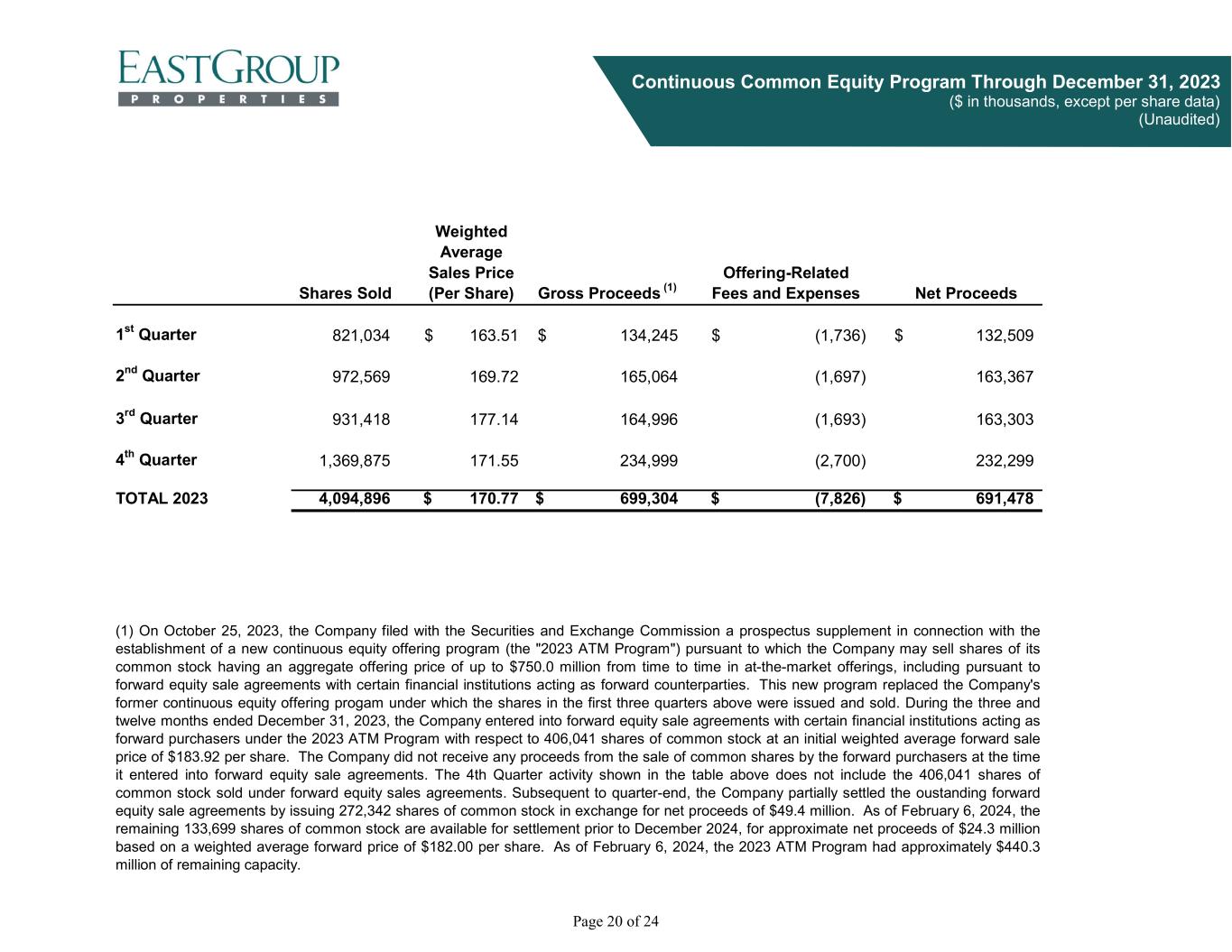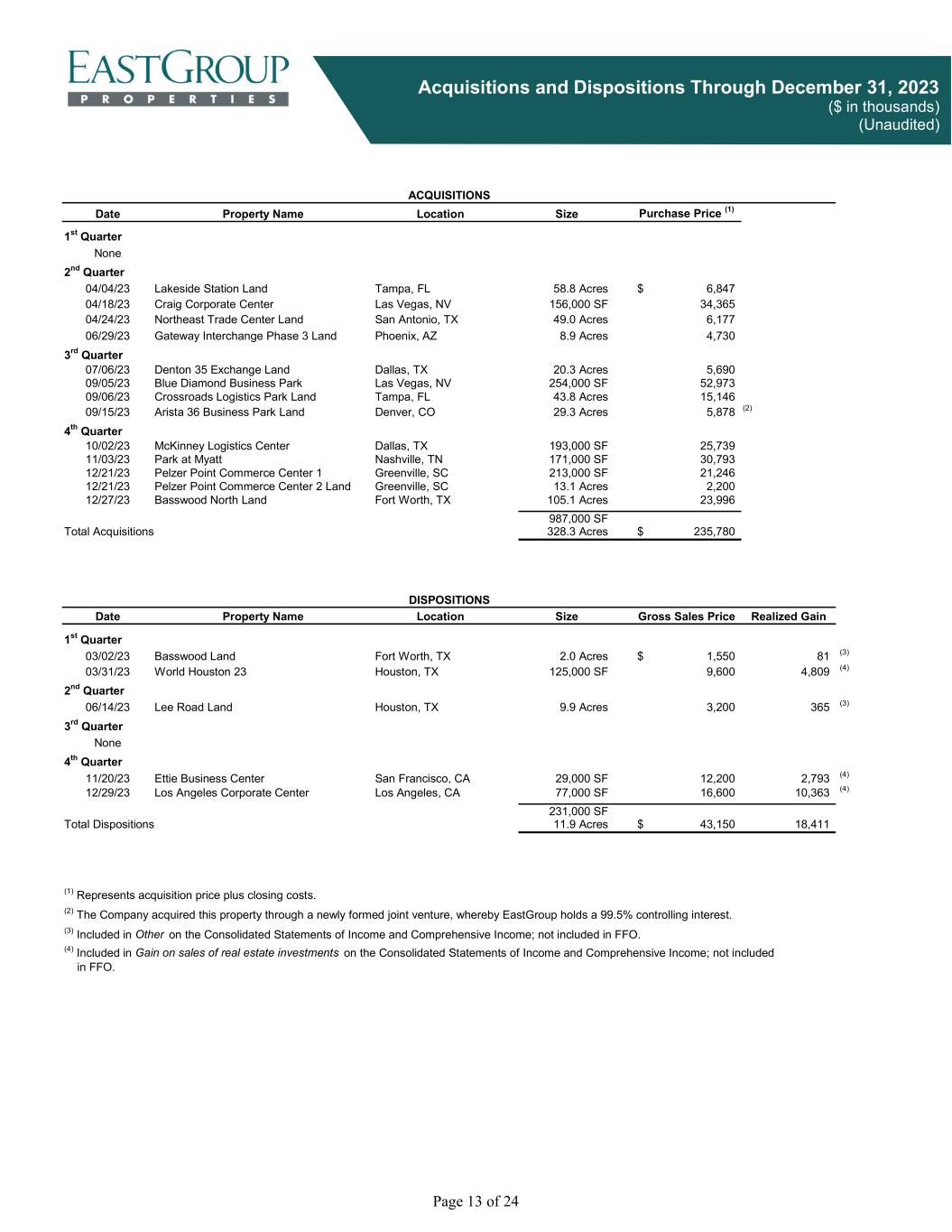 •EastGroup recognized gains on sales of real estate investments of $13,156,000 ($0.28 per share) during the three months ended December 31, 2023, compared to none during the three months ended December 31, 2022.