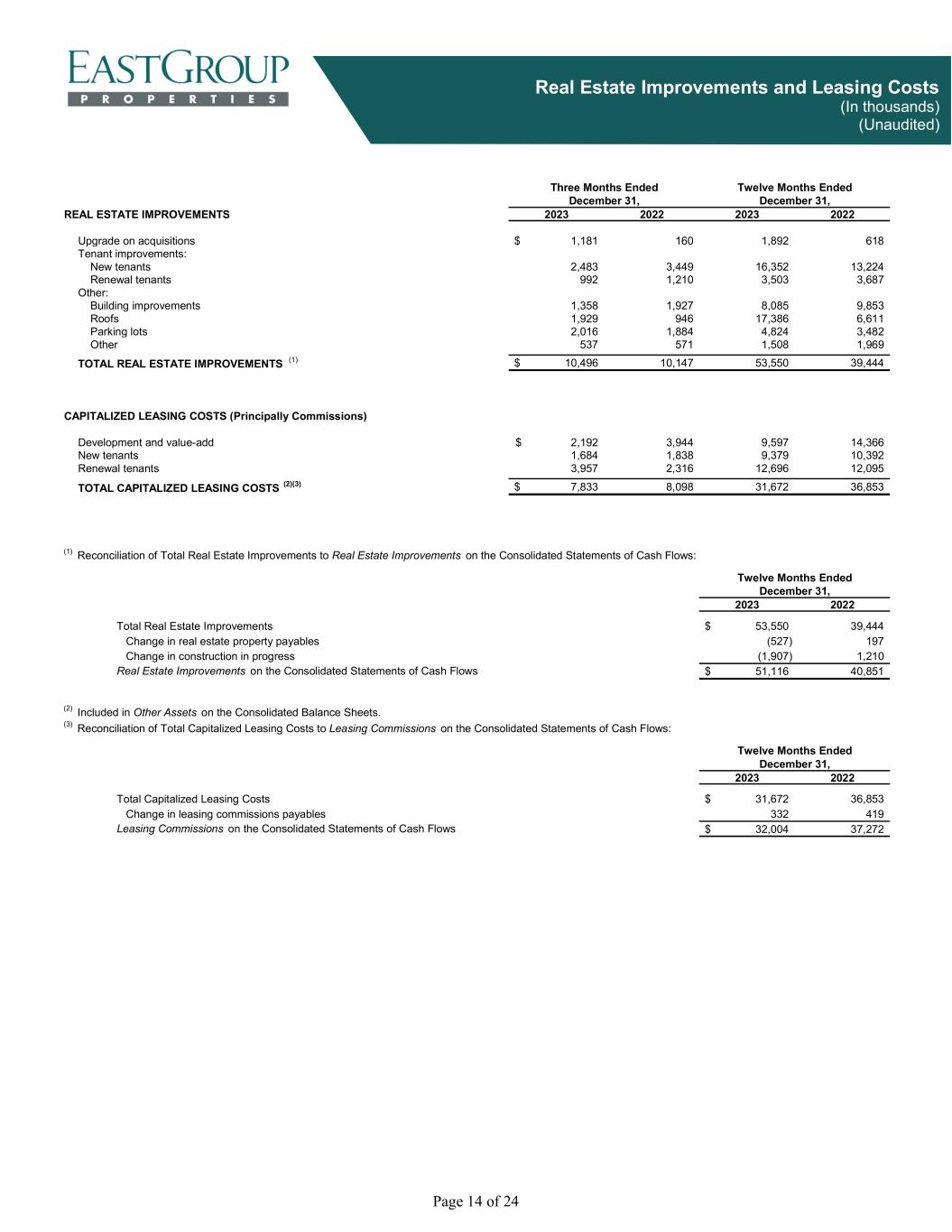 Page 14 of 24 Real Estate Improvements and Leasing Costs (In thousands) (Unaudited) REAL ESTATE IMPROVEMENTS 2023 2022 2023 2022 Upgrade on acquisitions 1,181$ 160 1,892 618 Tenant improvements: New tenants 2,483 3,449 16,352 13,224 Renewal tenants 992 1,210 3,503 3,687 Other: Building improvements 1,358 1,927 8,085 9,853 Roofs 1,929 946 17,386 6,611 Parking lots 2,016 1,884 4,824 3,482 Other 537 571 1,508 1,969 TOTAL REAL ESTATE IMPROVEMENTS (1) 10,496$ 10,147 53,550 39,444 CAPITALIZED LEASING COSTS (Principally Commissions) Development and value-add 2,192$ 3,944 9,597 14,366 New tenants 1,684 1,838 9,379 10,392 Renewal tenants 3,957 2,316 12,696 12,095 TOTAL CAPITALIZED LEASING COSTS (2)(3) 7,833$ 8,098 31,672 36,853 (1) Reconciliation of Total Real Estate Improvements to Real Estate Improvements on the Consolidated Statements of Cash Flows: 2023 2022 Total Real Estate Improvements 53,550$ 39,444 Change in real estate property payables (527) 197 Change in construction in progress (1,907) 1,210 51,116$ 40,851 (2) Included in Other Assets on the Consolidated Balance Sheets. (3) Reconciliation of Total Capitalized Leasing Costs to Leasing Commissions on the Consolidated Statements of Cash Flows: 2023 2022 Total Capitalized Leasing Costs 31,672$ 36,853 Change in leasing commissions payables 332 419 32,004$ 37,272 Twelve Months Ended December 31, Twelve Months EndedThree Months Ended December 31, Twelve Months Ended December 31, Leasing Commissions on the Consolidated Statements of Cash Flows December 31, Real Estate Improvements on the Consolidated Statements of Cash Flows