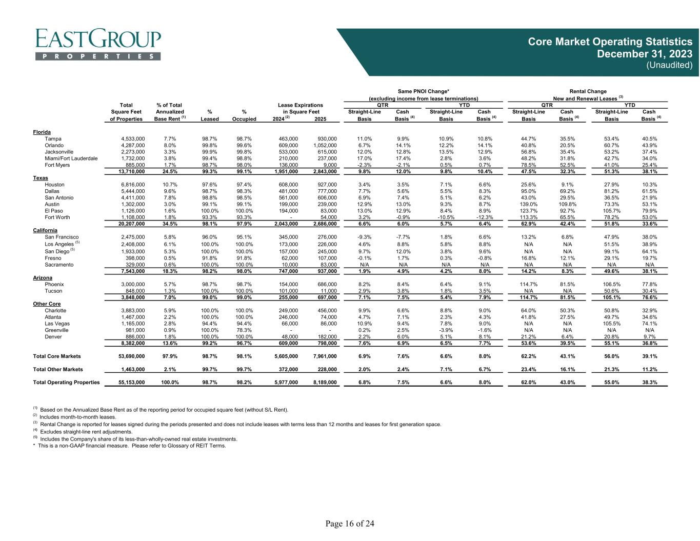 Page 15 of 24 Leasing Statistics and Occupancy Summary (Unaudited) Three Months Ended Number of Square Feet Weighted Rental Change Rental Change PSF Tenant PSF Leasing PSF Total December 31, 2023 Leases Signed Signed Average Term Straight-Line Basis (1) Cash Basis (1) Improvement (2) Commission (2) Leasing Cost (2) (In Thousands) (In Years) New Leases (3) 24 222 5.7 57.4% 42.5% 5.85$ 4.93$ 10.78$ Renewal Leases 57 1,748 4.9 62.9% 43.0% 0.95 2.07 3.02 Total/Weighted Average 81 1,970 5.0 62.0% 43.0% 1.50$ 2.40$ 3.90$ Per Year 0.30$ 0.48$ 0.78$ Weighted Average Retention (4) 93.2% Twelve Months Ended Number of Square Feet Weighted Rental Change Rental Change PSF Tenant PSF Leasing PSF Total December 31, 2023 Leases Signed Signed Average Term Straight-Line Basis (1) Cash Basis (1) Improvement (2) Commission (2) Leasing Cost (2) (In Thousands) (In Years) New Leases (3) 109 2,056 5.5 55.1% 41.7% 4.29$ 4.02$ 8.31$ Renewal Leases 228 6,073 4.7 54.9% 37.1% 0.89 2.06 2.95 Total/Weighted Average 337 8,129 4.9 55.0% 38.3% 1.75$ 2.55$ 4.30$ Per Year 0.36$ 0.52$ 0.88$ Weighted Average Retention (4) 79.2% 12/31/23 09/30/23 06/30/23 03/31/23 12/31/22 Percentage Leased 98.7% 98.5% 98.5% 98.7% 98.7% Percentage Occupied 98.2% 97.7% 98.2% 97.9% 98.3% (1) Rental Change is reported for leases signed during the periods presented. (2) Per square foot (PSF) amounts represent total amounts for the life of the lease, except as noted for the Per Year amounts. (3) Does not include leases with terms less than 12 months and leases for first generation space. (4) Calculated as square feet of renewal leases signed during the quarter / square feet of leases expiring during the quarter (not including early terminations or bankruptcies).