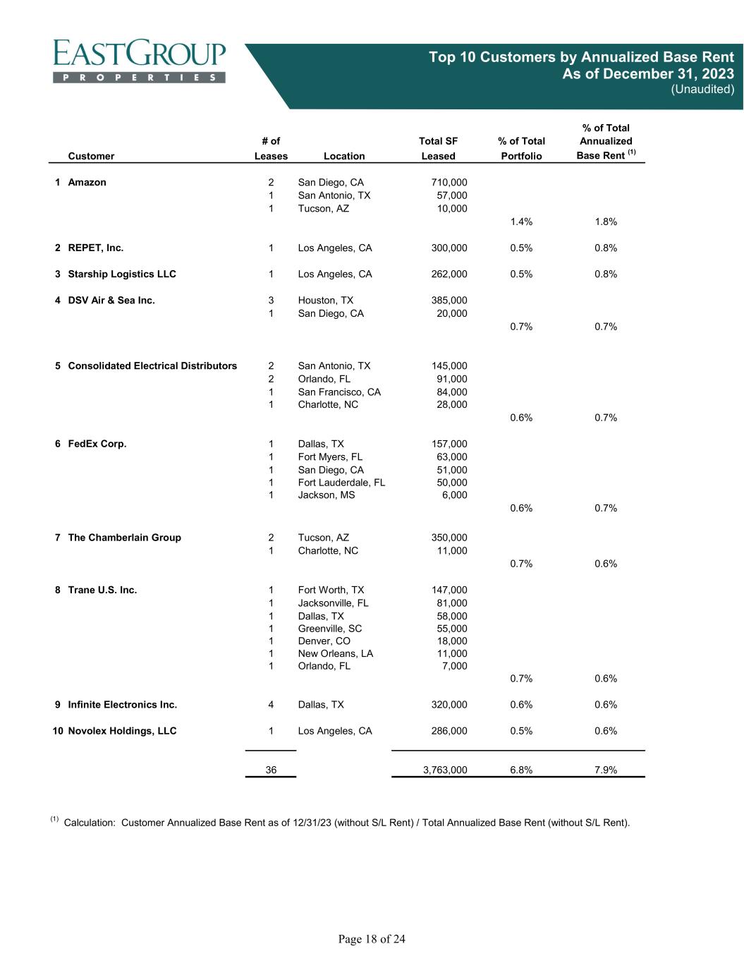 Page 18 of 24 Top 10 Customers by Annualized Base Rent As of December 31, 2023 (Unaudited) % of Total # of % of Total Annualized Customer Leases Location Portfolio Base Rent (1) 1 Amazon 2 San Diego, CA 710,000 1 San Antonio, TX 57,000 1 Tucson, AZ 10,000 1.4% 1.8% 2 REPET, Inc. 1 Los Angeles, CA 300,000 0.5% 0.8% 3 Starship Logistics LLC 1 Los Angeles, CA 262,000 0.5% 0.8% 4 DSV Air & Sea Inc. 3 Houston, TX 385,000 1 San Diego, CA 20,000 0.7% 0.7% 5 Consolidated Electrical Distributors 2 San Antonio, TX 145,000 2 Orlando, FL 91,000 1 San Francisco, CA 84,000 1 Charlotte, NC 28,000 0.6% 0.7% 6 FedEx Corp. 1 Dallas, TX 157,000 1 Fort Myers, FL 63,000 1 San Diego, CA 51,000 1 Fort Lauderdale, FL 50,000 1 Jackson, MS 6,000 0.6% 0.7% 7 The Chamberlain Group 2 Tucson, AZ 350,000 1 Charlotte, NC 11,000 0.7% 0.6% 8 Trane U.S. Inc. 1 Fort Worth, TX 147,000 1 Jacksonville, FL 81,000 1 Dallas, TX 58,000 1 Greenville, SC 55,000 1 Denver, CO 18,000 1 New Orleans, LA 11,000 1 Orlando, FL 7,000 0.7% 0.6% 9 Infinite Electronics Inc. 4 Dallas, TX 320,000 0.6% 0.6% 10 Novolex Holdings, LLC 1 Los Angeles, CA 286,000 0.5% 0.6% 36 3,763,000 6.8% 7.9% (1) Calculation: Customer Annualized Base Rent as of 12/31/23 (without S/L Rent) / Total Annualized Base Rent (without S/L Rent). Leased Total SF