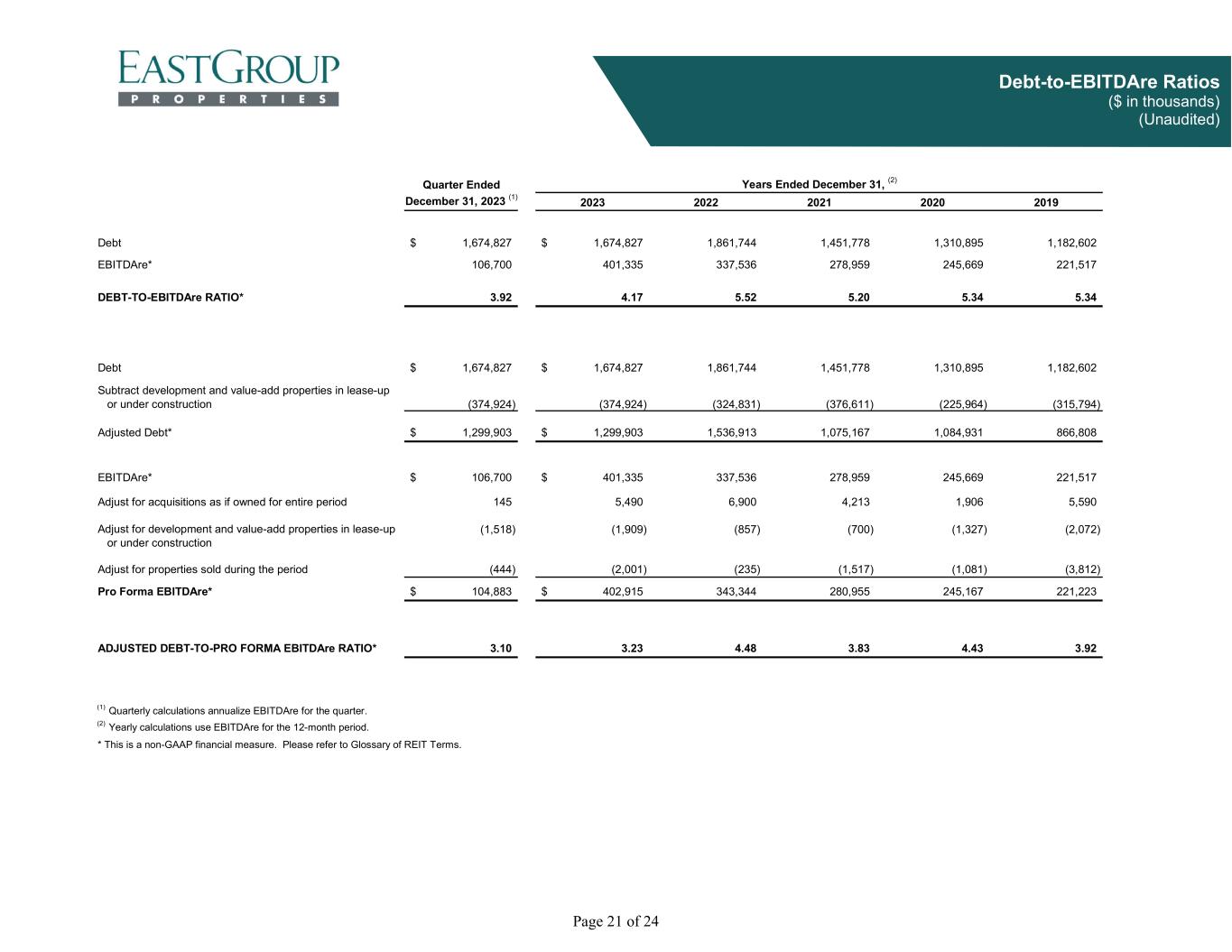 Page 21 of 24 Debt-to-EBITDAre Ratios ($ in thousands) (Unaudited) Quarter Ended December 31, 2023 (1) 2023 2022 2021 2020 2019 Debt 1,674,827$ 1,674,827$ 1,861,744 1,451,778 1,310,895 1,182,602 EBITDAre* 106,700 401,335 337,536 278,959 245,669 221,517 DEBT-TO-EBITDAre RATIO* 3.92 4.17 5.52 5.20 5.34 5.34 Debt 1,674,827$ 1,674,827$ 1,861,744 1,451,778 1,310,895 1,182,602 Subtract development and value-add properties in lease-up or under construction (374,924) (374,924) (324,831) (376,611) (225,964) (315,794) Adjusted Debt* 1,299,903$ 1,299,903$ 1,536,913 1,075,167 1,084,931 866,808 EBITDAre* 106,700$ 401,335$ 337,536 278,959 245,669 221,517 Adjust for acquisitions as if owned for entire period 145 5,490 6,900 4,213 1,906 5,590 Adjust for development and value-add properties in lease-up or under construction (1,518) (1,909) (857) (700) (1,327) (2,072) Adjust for properties sold during the period (444) (2,001) (235) (1,517) (1,081) (3,812) Pro Forma EBITDAre* 104,883$ 402,915$ 343,344 280,955 245,167 221,223 ADJUSTED DEBT-TO-PRO FORMA EBITDAre RATIO* 3.10 3.23 4.48 3.83 4.43 3.92 (1) Quarterly calculations annualize EBITDAre for the quarter. (2) Yearly calculations use EBITDAre for the 12-month period. * This is a non-GAAP financial measure. Please refer to Glossary of REIT Terms. Years Ended December 31, (2)
