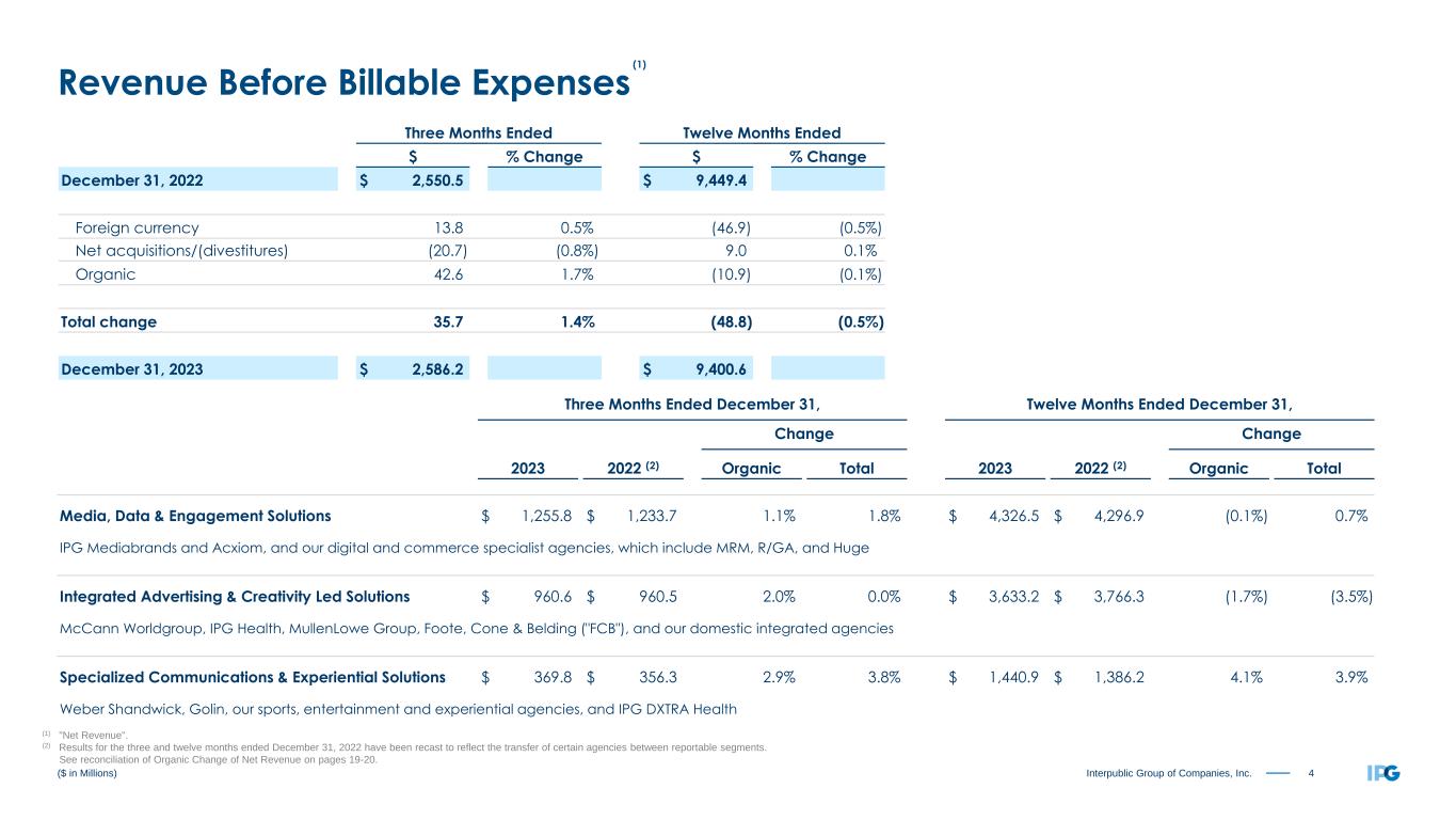 4Interpublic Group of Companies, Inc. Three Months Ended Twelve Months Ended $ % Change $ % Change December 31, 2022 $ 2,550.5 $ 9,449.4 Foreign currency 13.8 0.5% (46.9) (0.5%) Net acquisitions/(divestitures) (20.7) (0.8%) 9.0 0.1% Organic 42.6 1.7% (10.9) (0.1%) Total change 35.7 1.4% (48.8) (0.5%) December 31, 2023 $ 2,586.2 $ 9,400.6 ($ in Millions) Revenue Before Billable Expenses Three Months Ended December 31, Twelve Months Ended December 31, Change Change 2023 2022 (2) Organic Total 2023 2022 (2) Organic Total Media, Data & Engagement Solutions $ 1,255.8 $ 1,233.7 1.1% 1.8% $ 4,326.5 $ 4,296.9 (0.1%) 0.7% IPG Mediabrands and Acxiom, and our digital and commerce specialist agencies, which include MRM, R/GA, and Huge Integrated Advertising & Creativity Led Solutions $ 960.6 $ 960.5 2.0% 0.0% $ 3,633.2 $ 3,766.3 (1.7%) (3.5%) McCann Worldgroup, IPG Health, MullenLowe Group, Foote, Cone & Belding ("FCB"), and our domestic integrated agencies Specialized Communications & Experiential Solutions $ 369.8 $ 356.3 2.9% 3.8% $ 1,440.9 $ 1,386.2 4.1% 3.9% Weber Shandwick, Golin, our sports, entertainment and experiential agencies, and IPG DXTRA Health (1) "Net Revenue". (2) Results for the three and twelve months ended December 31, 2022 have been recast to reflect the transfer of certain agencies between reportable segments. See reconciliation of Organic Change of Net Revenue on pages 19-20. (1)