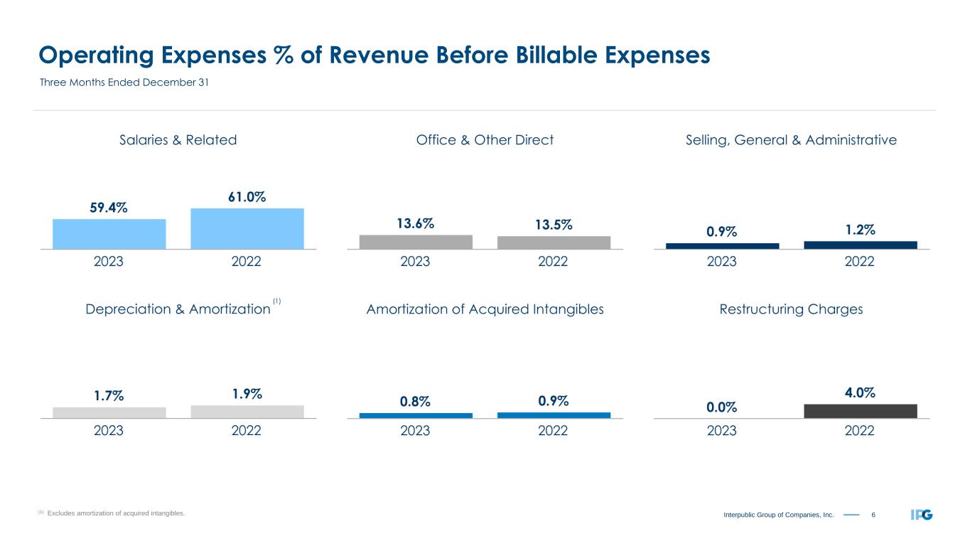 3Interpublic Group of Companies, Inc. Three Months Ended December 31, 2023 2022 Revenue Before Billable Expenses $ 2,586.2 $ 2,550.5 Billable Expenses 437.1 435.4 Total Revenue 3,023.3 2,985.9 Salaries and Related Expenses 1,536.9 1,556.9 Office and Other Direct Expenses 352.9 345.3 Billable Expenses 437.1 435.4 Cost of Services 2,326.9 2,337.6 Selling, General and Administrative Expenses 23.5 29.9 Depreciation and Amortization 65.3 72.1 Restructuring Charges 0.8 101.7 Total Operating Expense 2,416.5 2,541.3 Operating Income 606.8 444.6 Interest Expense, Net (17.9) (24.0) Other Income (Expense), Net 35.0 (7.8) Income Before Income Taxes 623.9 412.8 Provision for Income Taxes 155.3 109.2 Equity in Net Income of Unconsolidated Affiliates 3.0 2.3 Net Income 471.6 305.9 Net Income Attributable to Noncontrolling Interests (8.4) (8.7) Net Income Available to IPG Common Stockholders $ 463.2 $ 297.2 Earnings per Share Available to IPG Common Stockholders - Basic $ 1.21 $ 0.77 Earnings per Share Available to IPG Common Stockholders - Diluted $ 1.21 $ 0.76 Weighted-Average Number of Common Shares Outstanding - Basic 381.4 387.9 Weighted-Average Number of Common Shares Outstanding - Diluted 383.4 392.1 Dividends Declared per Common Share $ 0.310 $ 0.290 ($ in Millions, except per share amounts) Operating Performance