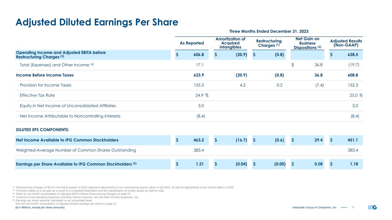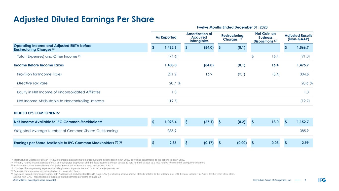 •Full year 2023 net income available to IPG common stockholders was $1,098.4 million, resulting in earnings of $2.86 per basic share and $2.85 per diluted share, compared to $2.40 and $2.37, respectively, for the same period in 2022. Adjusted earnings were $2.99 per diluted share as adjusted for after-tax amortization of acquired intangibles of $67.1 million, after-tax restructuring charges of $0.2 million and an after-tax gain of $13.0 million on the sales of businesses. Full year 2023 basic and diluted earnings per share, both as reported and adjusted, include a positive impact of $0.17 related to the settlement of U.S. Federal Income Tax Audits for the years 2017-2018. Adjusted earnings were $2.75 per diluted share a year ago.