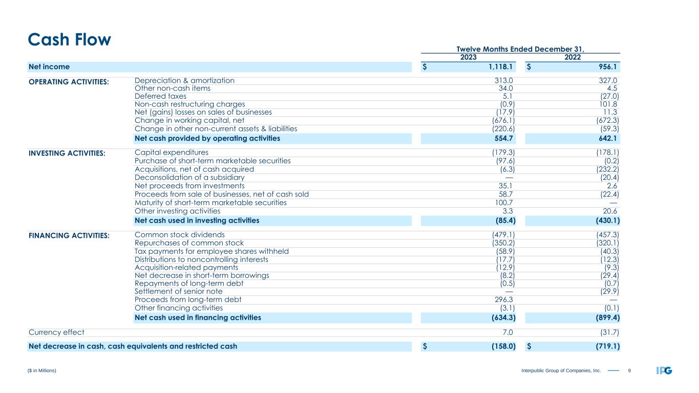 17Interpublic Group of Companies, Inc. Three Months Ended December 31, 2023 2022 Net income $ 471.6 $ 305.9 OPERATING ACTIVITIES: Depreciation & amortization 76.3 84.9 Deferred taxes 10.6 (53.0) Other non-cash items 9.5 9.7 Non-cash restructuring charges 0.8 101.3 Net (gains) losses on sales of businesses (36.8) 7.3 Change in working capital, net 423.0 851.3 Change in other non-current assets & liabilities (60.2) (6.5) Net cash provided by operating activities 894.8 1,300.9 INVESTING ACTIVITIES: Maturity of short-term marketable securities 100.7 — Proceeds from sale of businesses, net of cash sold 57.3 (18.3) Net proceeds from investments 13.4 — Acquisitions, net of cash acquired — (232.2) Purchase of short-term marketable securities — (0.2) Capital expenditures (52.2) (59.6) Other investing activities (0.3) 6.4 Net cash provided by (used in) investing activities 118.9 (303.9) FINANCING ACTIVITIES: Repurchases of common stock (131.2) (98.5) Common stock dividends (117.9) (112.2) Distributions to noncontrolling interests (4.0) (2.7) Tax payments for employee shares withheld (0.5) (0.4) Repayments of long-term debt (0.3) (0.3) Acquisition-related payments (0.1) (0.9) Settlement of senior note — (29.9) Net increase (decrease) in short-term borrowings 9.8 (1.6) Other financing activities (0.1) — Net cash used in financing activities (244.3) (246.5) Currency effect 42.0 27.5 Net increase in cash, cash equivalents and restricted cash $ 811.4 $ 778.0 ($ in Millions) Cash Flow