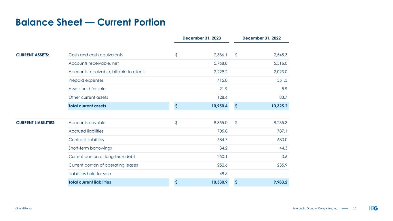 10Interpublic Group of Companies, Inc. December 31, 2023 December 31, 2022 CURRENT ASSETS: Cash and cash equivalents $ 2,386.1 $ 2,545.3 Accounts receivable, net 5,768.8 5,316.0 Accounts receivable, billable to clients 2,229.2 2,023.0 Prepaid expenses 415.8 351.3 Assets held for sale 21.9 5.9 Other current assets 128.6 83.7 Total current assets $ 10,950.4 $ 10,325.2 CURRENT LIABILITIES: Accounts payable $ 8,355.0 $ 8,235.3 Accrued liabilities 705.8 787.1 Contract liabilities 684.7 680.0 Short-term borrowings 34.2 44.3 Current portion of long-term debt 250.1 0.6 Current portion of operating leases 252.6 235.9 Liabilities held for sale 48.5 — Total current liabilities $ 10,330.9 $ 9,983.2 ($ in Millions) Balance Sheet — Current Portion