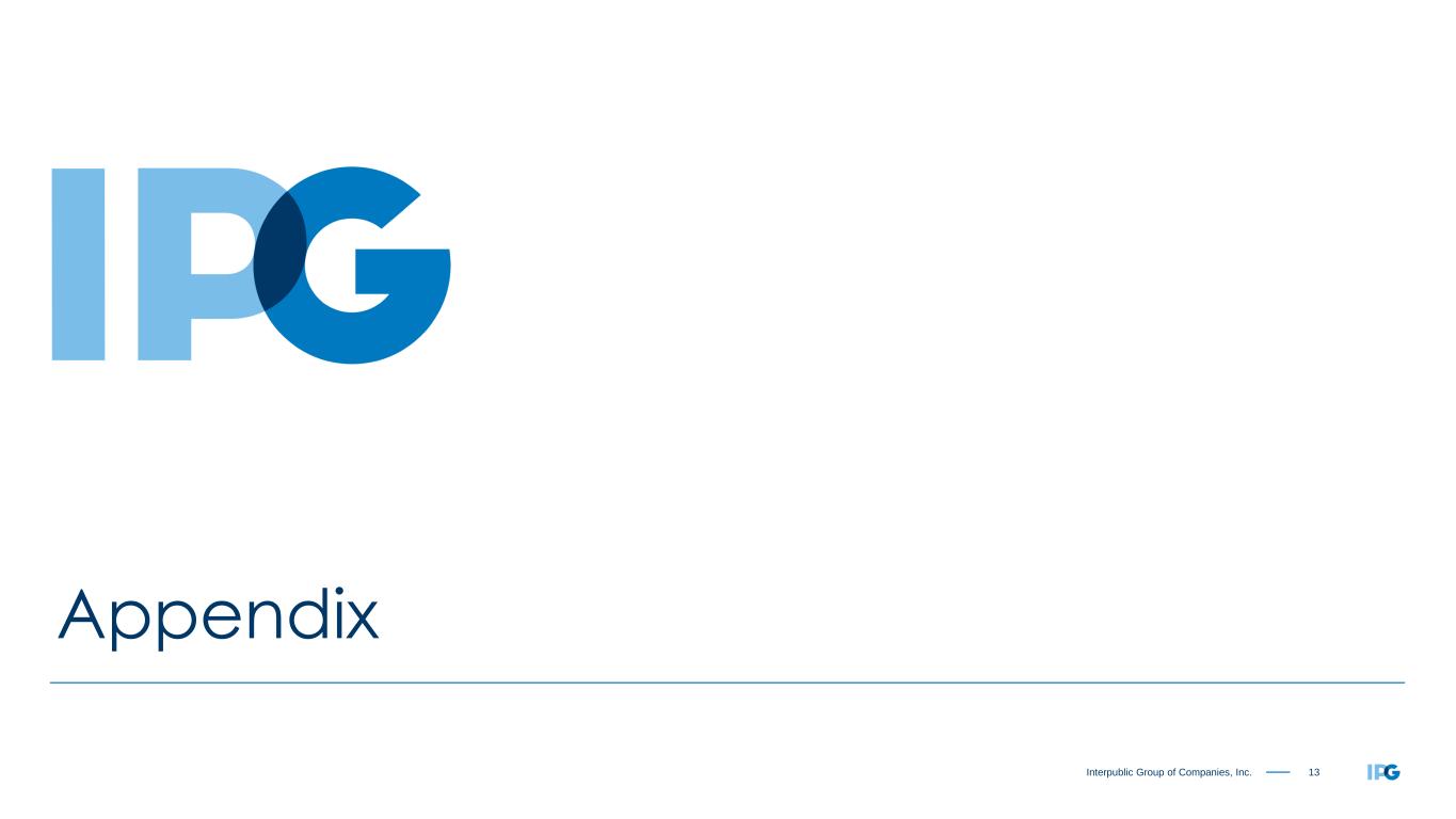 12Interpublic Group of Companies, Inc. Summary • Focus on driving growth and building on our strong long-term track record ◦ Dynamic media offering, leading healthcare capabilities, and exceptional talent across a full range of marketing services ◦ Scaled data management and proprietary identity resolution products ◦ Seamless delivery of integrated "open architecture" client solutions • Furthering investment in emerging opportunities o High-growth media channels and digital commerce o Development of new media buying models o Personalized, data-infused creativity o Increasingly incorporating Gen AI across the enterprise • Effective and proven expense management remains an ongoing priority, as does continued streamlining of operations and processes • Financial strength is a continued source of value creation