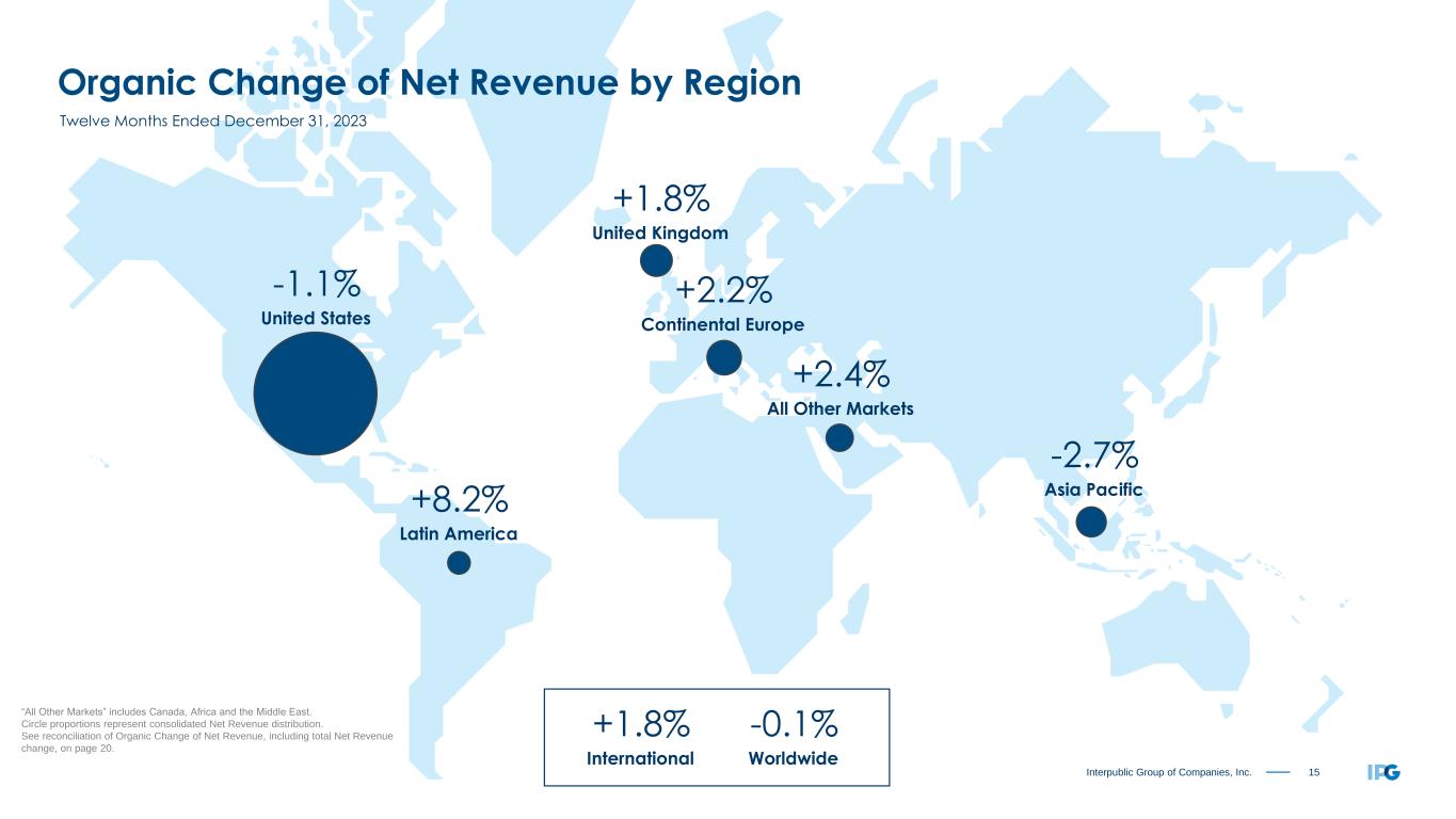 20Interpublic Group of Companies, Inc. ($ in Millions) Reconciliation of Organic Change of Net Revenue Components of Change Change Twelve Months Ended December 31, 2022 Foreign Currency Net Acquisitions/ (Divestitures) Organic Twelve Months Ended December 31, 2023 Organic Total SEGMENT: Media, Data & Engagement Solutions (1) (2) $ 4,296.9 $ (19.9) $ 54.0 $ (4.5) $ 4,326.5 (0.1%) 0.7% Integrated Advertising & Creativity Led Solutions (1) (3) 3,766.3 (25.1) (44.4) (63.6) 3,633.2 (1.7%) (3.5%) Specialized Communications & Experiential Solutions (1) (4) 1,386.2 (1.9) (0.6) 57.2 1,440.9 4.1% 3.9% Total $ 9,449.4 $ (46.9) $ 9.0 $ (10.9) $ 9,400.6 (0.1%) (0.5%) GEOGRAPHIC: United States $ 6,157.7 $ 0.0 $ 13.2 $ (68.7) $ 6,102.2 (1.1%) (0.9%) International 3,291.7 (46.9) (4.2) 57.8 3,298.4 1.8% 0.2% United Kingdom 742.2 4.0 0.0 13.0 759.2 1.8% 2.3% Continental Europe 764.6 14.1 0.0 17.0 795.7 2.2% 4.1% Asia Pacific 772.7 (27.0) 5.3 (21.2) 729.8 (2.7%) (5.6%) Latin America 423.6 (8.4) (1.4) 34.9 448.7 8.2% 5.9% All Other Markets 588.6 (29.6) (8.1) 14.1 565.0 2.4% (4.0%) Worldwide $ 9,449.4 $ (46.9) $ 9.0 $ (10.9) $ 9,400.6 (0.1%) (0.5%) (1) Results for twelve months ended December 31, 2022 have been recast to reflect the transfer of certain agencies between reportable segments. (2) Comprised of IPG Mediabrands and Acxiom, and our digital and commerce specialist agencies, which include MRM, R/GA, and Huge. (3) Comprised of McCann Worldgroup, IPG Health, MullenLowe Group, Foote, Cone & Belding ("FCB"), and our domestic integrated agencies. (4) Comprised of Weber Shandwick, Golin, our sports, entertainment and experiential agencies, and IPG DXTRA Health.
