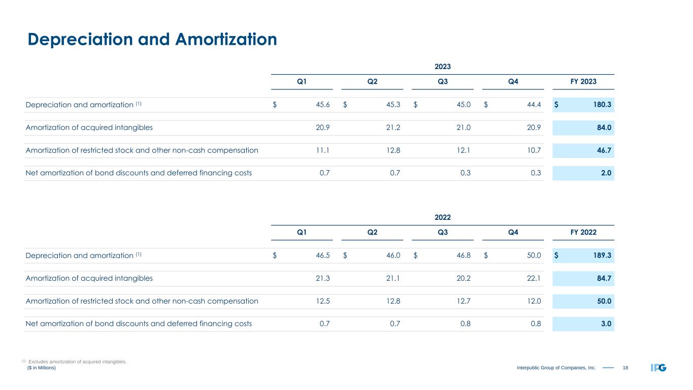 18Interpublic Group of Companies, Inc. 2023 Q1 Q2 Q3 Q4 FY 2023 Depreciation and amortization (1) $ 45.6 $ 45.3 $ 45.0 $ 44.4 $ 180.3 Amortization of acquired intangibles 20.9 21.2 21.0 20.9 84.0 Amortization of restricted stock and other non-cash compensation 11.1 12.8 12.1 10.7 46.7 Net amortization of bond discounts and deferred financing costs 0.7 0.7 0.3 0.3 2.0 2022 Q1 Q2 Q3 Q4 FY 2022 Depreciation and amortization (1) $ 46.5 $ 46.0 $ 46.8 $ 50.0 $ 189.3 Amortization of acquired intangibles 21.3 21.1 20.2 22.1 84.7 Amortization of restricted stock and other non-cash compensation 12.5 12.8 12.7 12.0 50.0 Net amortization of bond discounts and deferred financing costs 0.7 0.7 0.8 0.8 3.0 ($ in Millions) (1) Excludes amortization of acquired intangibles. Depreciation and Amortization
