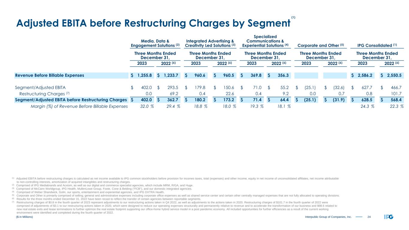 24Interpublic Group of Companies, Inc. ($ in Millions) (1) Adjusted EBITA before restructuring charges is calculated as net income available to IPG common stockholders before provision for incomes taxes, total (expenses) and other income, equity in net income of unconsolidated affiliates, net income attributable to non-controlling interests, amortization of acquired intangibles and restructuring charges. (2) Comprised of IPG Mediabrands and Acxiom, as well as our digital and commerce specialist agencies, which include MRM, R/GA, and Huge. (3) Comprised of McCann Worldgroup, IPG Health, MullenLowe Group, Foote, Cone & Belding ("FCB"), and our domestic integrated agencies. (4) Comprised of Weber Shandwick, Golin, our sports, entertainment and experiential agencies, and IPG DXTRA Health. (5) Corporate and Other is primarily comprised of selling, general and administrative expenses including corporate office expenses as well as shared service center and certain other centrally managed expenses that are not fully allocated to operating divisions. (6) Results for the three months ended December 31, 2022 have been recast to reflect the transfer of certain agencies between reportable segments. (7) Restructuring charges of $0.8 in the fourth quarter of 2023 represent adjustments to our restructuring actions taken in Q4 2022, as well as adjustments to the actions taken in 2020. Restructuring charges of $101.7 in the fourth quarter of 2022 were comprised of adjustments of $3.1 to our restructuring actions taken in 2020, which were designed to reduce our operating expenses structurally and permanently relative to revenue and to accelerate the transformation of our business and $98.6 related to new real estate exits and lease terminations to further optimize the real estate footprint supporting our office-home hybrid service model in a post pandemic economy. All included opportunities for further efficiencies as a result of the current working environment were identified and completed during the fourth quarter of 2022. Media, Data & Engagement Solutions (2) Integrated Advertising & Creativity Led Solutions (3) Specialized Communications & Experiential Solutions (4) Corporate and Other (5) IPG Consolidated (1) Three Months Ended December 31, Three Months Ended December 31, Three Months Ended December 31, Three Months Ended December 31, Three Months Ended December 31, 2023 2022 (6) 2023 2022 (6) 2023 2022 (6) 2023 2022 (6) 2023 2022 (6) Revenue Before Billable Expenses $ 1,255.8 $ 1,233.7 $ 960.6 $ 960.5 $ 369.8 $ 356.3 $ 2,586.2 $ 2,550.5 Segment/Adjusted EBITA $ 402.0 $ 293.5 $ 179.8 $ 150.6 $ 71.0 $ 55.2 $ (25.1) $ (32.6) $ 627.7 $ 466.7 Restructuring Charges (7) 0.0 69.2 0.4 22.6 0.4 9.2 0.0 0.7 0.8 101.7 Segment/Adjusted EBITA before Restructuring Charges $ 402.0 $ 362.7 $ 180.2 $ 173.2 $ 71.4 $ 64.4 $ (25.1) $ (31.9) $ 628.5 $ 568.4 Margin (%) of Revenue Before Billable Expenses 32.0 % 29.4 % 18.8 % 18.0 % 19.3 % 18.1 % 24.3 % 22.3 % Adjusted EBITA before Restructuring Charges by Segment (1)