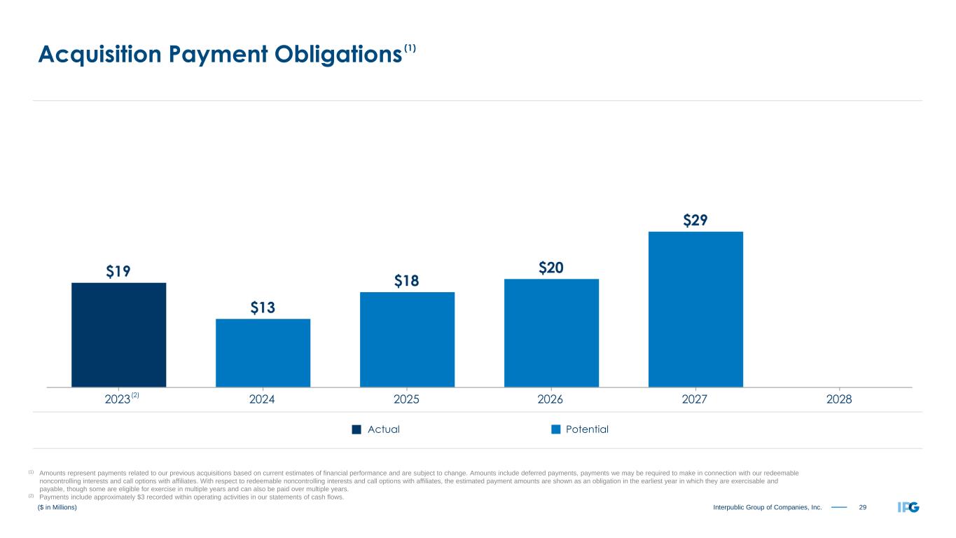29Interpublic Group of Companies, Inc. ($ in Millions) Acquisition Payment Obligations (1) Amounts represent payments related to our previous acquisitions based on current estimates of financial performance and are subject to change. Amounts include deferred payments, payments we may be required to make in connection with our redeemable noncontrolling interests and call options with affiliates. With respect to redeemable noncontrolling interests and call options with affiliates, the estimated payment amounts are shown as an obligation in the earliest year in which they are exercisable and payable, though some are eligible for exercise in multiple years and can also be paid over multiple years. (2) Payments include approximately $3 recorded within operating activities in our statements of cash flows. (2) PotentialActual (1)