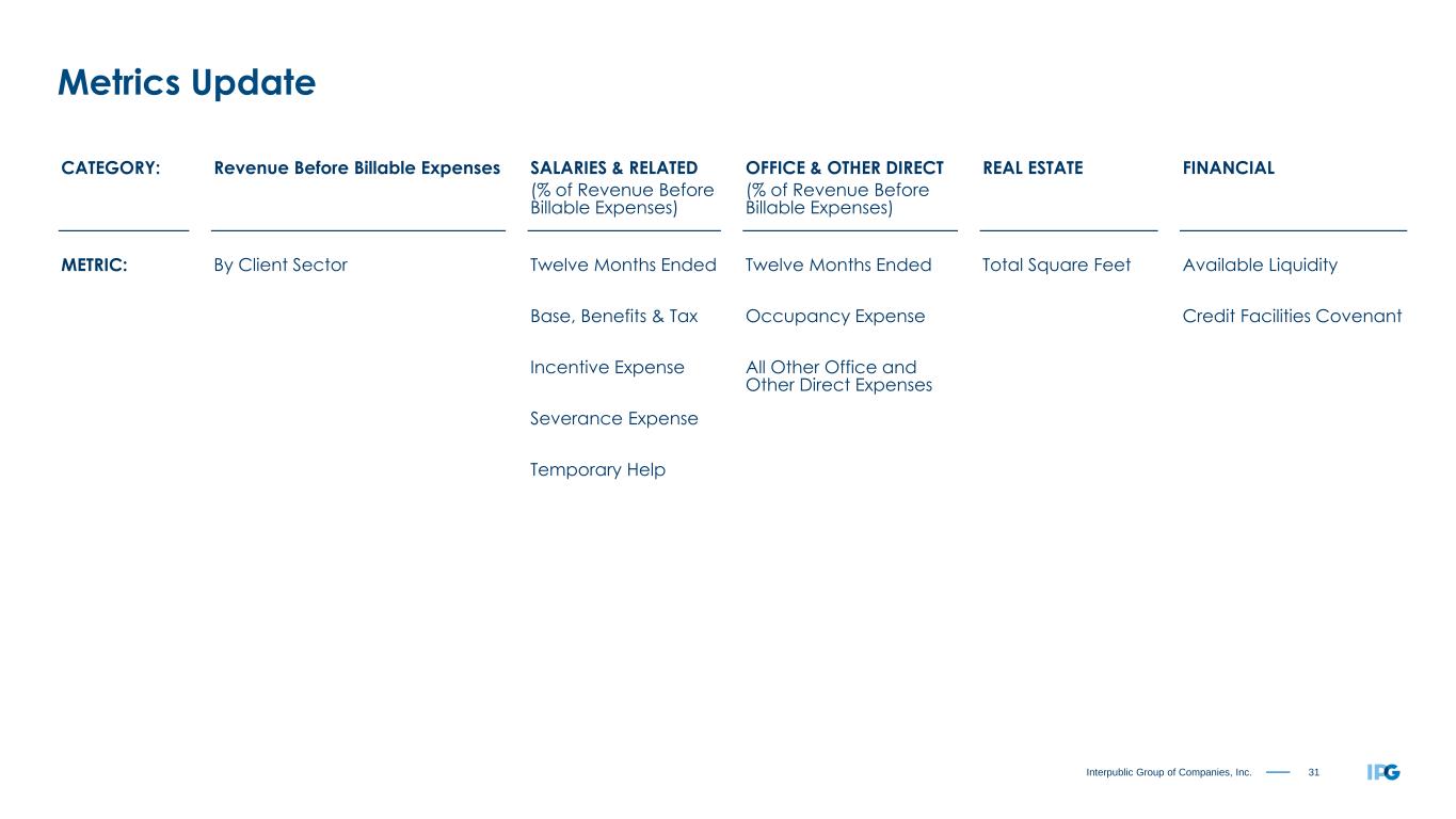 31Interpublic Group of Companies, Inc. Metrics Update CATEGORY: Revenue Before Billable Expenses SALARIES & RELATED OFFICE & OTHER DIRECT REAL ESTATE FINANCIAL (% of Revenue Before Billable Expenses) (% of Revenue Before Billable Expenses) METRIC: By Client Sector Twelve Months Ended Twelve Months Ended Total Square Feet Available Liquidity Base, Benefits & Tax Occupancy Expense Credit Facilities Covenant Incentive Expense All Other Office and Other Direct Expenses Severance Expense Temporary Help