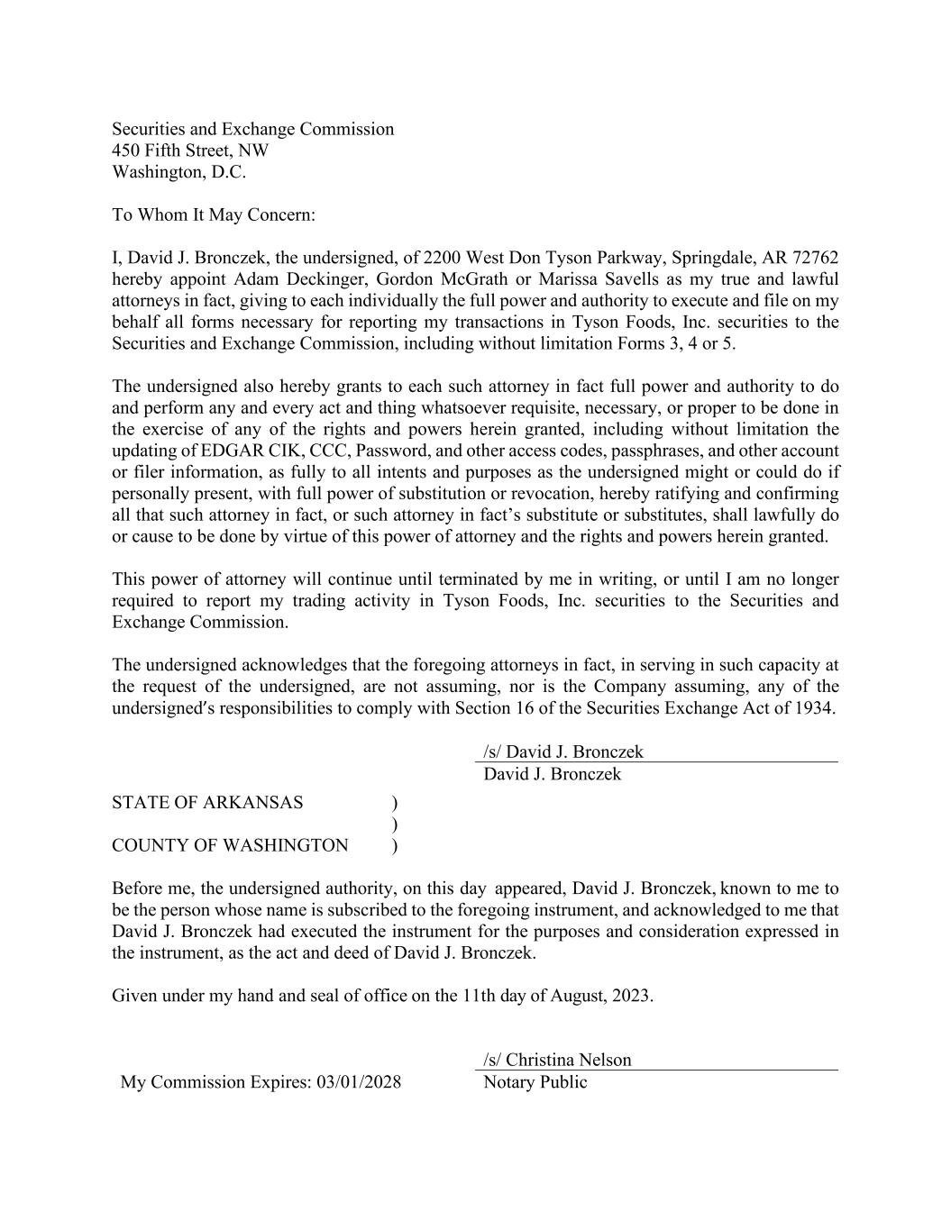 Securities and Exchange Commission 450 Fifth Street, NW Washington, D.C. To Whom It May Concern: I, David J. Bronczek, the undersigned, of 2200 West Don Tyson Parkway, Springdale, AR 72762 hereby appoint Adam Deckinger, Gordon McGrath or Marissa Savells as my true and lawful attorneys in fact, giving to each individually the full power and authority to execute and file on my behalf all forms necessary for reporting my transactions in Tyson Foods, Inc. securities to the Securities and Exchange Commission, including without limitation Forms 3, 4 or 5. The undersigned also hereby grants to each such attorney in fact full power and authority to do and perform any and every act and thing whatsoever requisite, necessary, or proper to be done in the exercise of any of the rights and powers herein granted, including without limitation the updating of EDGAR CIK, CCC, Password, and other access codes, passphrases, and other account or filer information, as fully to all intents and purposes as the undersigned might or could do if personally present, with full power of substitution or revocation, hereby ratifying and confirming all that such attorney in fact, or such attorney in fact’s substitute or substitutes, shall lawfully do or cause to be done by virtue of this power of attorney and the rights and powers herein granted. This power of attorney will continue until terminated by me in writing, or until I am no longer required to report my trading activity in Tyson Foods, Inc. securities to the Securities and Exchange Commission. The undersigned acknowledges that the foregoing attorneys in fact, in serving in such capacity at the request of the undersigned, are not assuming, nor is the Company assuming, any of the undersigned’s responsibilities to comply with Section 16 of the Securities Exchange Act of 1934. /s/ David J. Bronczek David J. Bronczek STATE OF ARKANSAS ) ) COUNTY OF WASHINGTON ) Before me, the undersigned authority, on this day appeared, David J. Bronczek, known to me to be the person whose name is subscribed to the foregoing instrument, and acknowledged to me that David J. Bronczek had executed the instrument for the purposes and consideration expressed in the instrument, as the act and deed of David J. Bronczek. Given under my hand and seal of office on the 11th day of August, 2023. /s/ Christina Nelson My Commission Expires: 03/01/2028 Notary Public