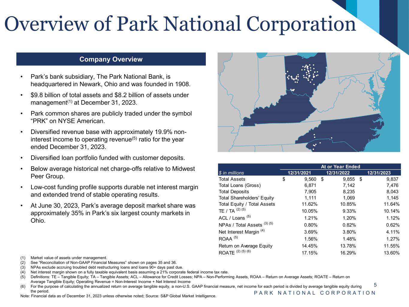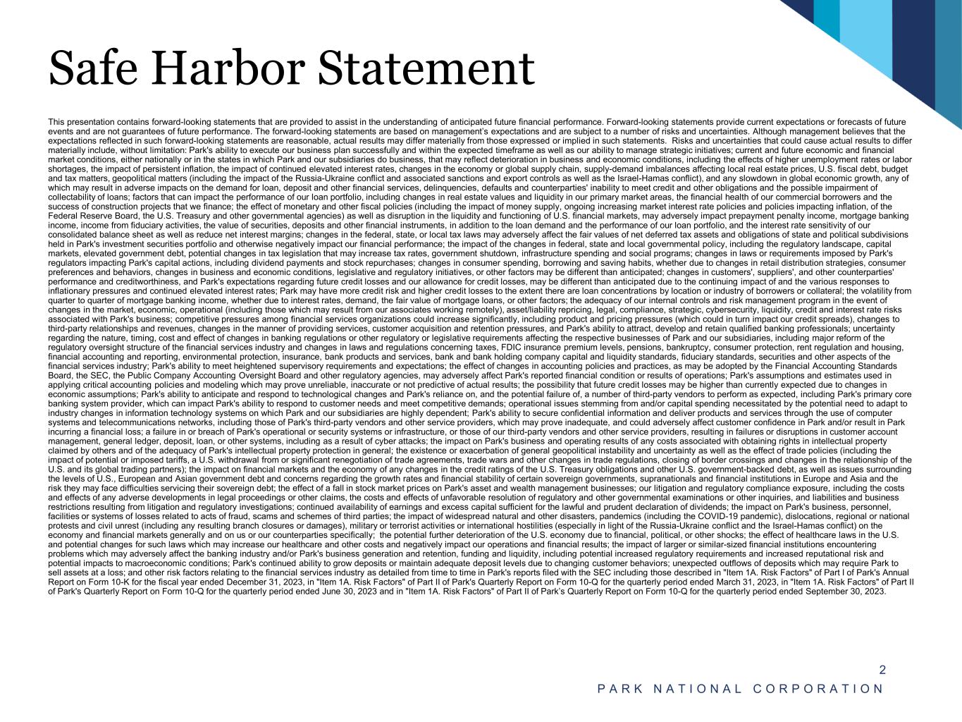 Safe Harbor Statement This presentation contains forward-looking statements that are provided to assist in the understanding of anticipated future financial performance. Forward-looking statements provide current expectations or forecasts of future events and are not guarantees of future performance. The forward-looking statements are based on management’s expectations and are subject to a number of risks and uncertainties. Although management believes that the expectations reflected in such forward-looking statements are reasonable, actual results may differ materially from those expressed or implied in such statements. Risks and uncertainties that could cause actual results to differ materially include, without limitation: Park's ability to execute our business plan successfully and within the expected timeframe as well as our ability to manage strategic initiatives; current and future economic and financial market conditions, either nationally or in the states in which Park and our subsidiaries do business, that may reflect deterioration in business and economic conditions, including the effects of higher unemployment rates or labor shortages, the impact of persistent inflation, the impact of continued elevated interest rates, changes in the economy or global supply chain, supply-demand imbalances affecting local real estate prices, U.S. fiscal debt, budget and tax matters, geopolitical matters (including the impact of the Russia-Ukraine conflict and associated sanctions and export controls as well as the Israel-Hamas conflict), and any slowdown in global economic growth, any of which may result in adverse impacts on the demand for loan, deposit and other financial services, delinquencies, defaults and counterparties' inability to meet credit and other obligations and the possible impairment of collectability of loans; factors that can impact the performance of our loan portfolio, including changes in real estate values and liquidity in our primary market areas, the financial health of our commercial borrowers and the success of construction projects that we finance; the effect of monetary and other fiscal policies (including the impact of money supply, ongoing increasing market interest rate policies and policies impacting inflation, of the Federal Reserve Board, the U.S. Treasury and other governmental agencies) as well as disruption in the liquidity and functioning of U.S. financial markets, may adversely impact prepayment penalty income, mortgage banking income, income from fiduciary activities, the value of securities, deposits and other financial instruments, in addition to the loan demand and the performance of our loan portfolio, and the interest rate sensitivity of our consolidated balance sheet as well as reduce net interest margins; changes in the federal, state, or local tax laws may adversely affect the fair values of net deferred tax assets and obligations of state and political subdivisions held in Park's investment securities portfolio and otherwise negatively impact our financial performance; the impact of the changes in federal, state and local governmental policy, including the regulatory landscape, capital markets, elevated government debt, potential changes in tax legislation that may increase tax rates, government shutdown, infrastructure spending and social programs; changes in laws or requirements imposed by Park's regulators impacting Park's capital actions, including dividend payments and stock repurchases; changes in consumer spending, borrowing and saving habits, whether due to changes in retail distribution strategies, consumer preferences and behaviors, changes in business and economic conditions, legislative and regulatory initiatives, or other factors may be different than anticipated; changes in customers', suppliers', and other counterparties' performance and creditworthiness, and Park's expectations regarding future credit losses and our allowance for credit losses, may be different than anticipated due to the continuing impact of and the various responses to inflationary pressures and continued elevated interest rates; Park may have more credit risk and higher credit losses to the extent there are loan concentrations by location or industry of borrowers or collateral; the volatility from quarter to quarter of mortgage banking income, whether due to interest rates, demand, the fair value of mortgage loans, or other factors; the adequacy of our internal controls and risk management program in the event of changes in the market, economic, operational (including those which may result from our associates working remotely), asset/liability repricing, legal, compliance, strategic, cybersecurity, liquidity, credit and interest rate risks associated with Park's business; competitive pressures among financial services organizations could increase significantly, including product and pricing pressures (which could in turn impact our credit spreads), changes to third-party relationships and revenues, changes in the manner of providing services, customer acquisition and retention pressures, and Park's ability to attract, develop and retain qualified banking professionals; uncertainty regarding the nature, timing, cost and effect of changes in banking regulations or other regulatory or legislative requirements affecting the respective businesses of Park and our subsidiaries, including major reform of the regulatory oversight structure of the financial services industry and changes in laws and regulations concerning taxes, FDIC insurance premium levels, pensions, bankruptcy, consumer protection, rent regulation and housing, financial accounting and reporting, environmental protection, insurance, bank products and services, bank and bank holding company capital and liquidity standards, fiduciary standards, securities and other aspects of the financial services industry; Park's ability to meet heightened supervisory requirements and expectations; the effect of ch