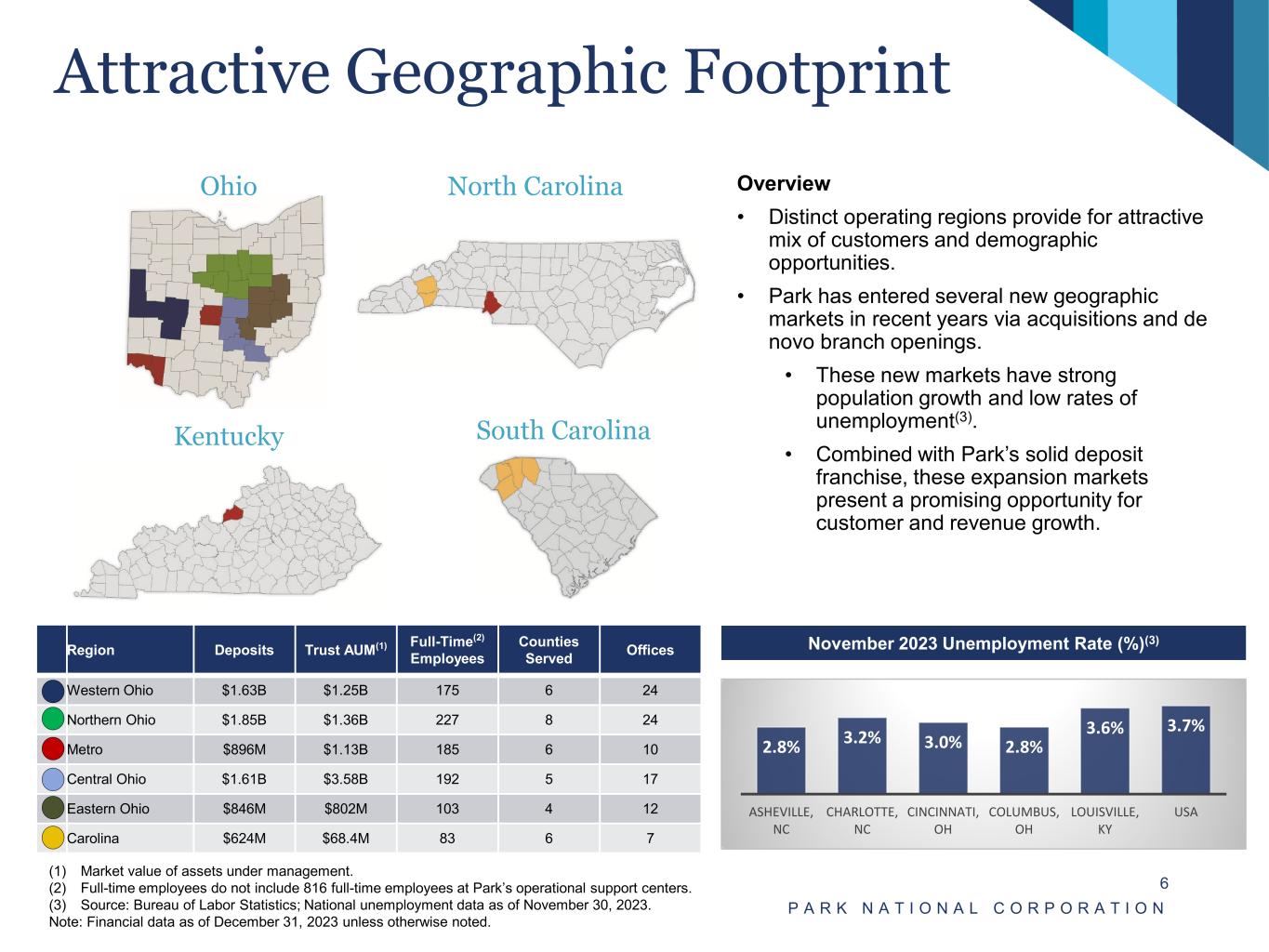 Overview of Park National Corporation P A R K N A T I O N A L C O R P O R A T I O N 5 • Park’s bank subsidiary, The Park National Bank, is headquartered in Newark, Ohio and was founded in 1908. • $9.8 billion of total assets and $8.2 billion of assets under management(1) at December 31, 2023. • Park common shares are publicly traded under the symbol “PRK” on NYSE American. • Diversified revenue base with approximately 19.9% non- interest income to operating revenue(5) ratio for the year ended December 31, 2023. • Diversified loan portfolio funded with customer deposits. • Below average historical net charge-offs relative to Midwest Peer Group. • Low-cost funding profile supports durable net interest margin and extended trend of stable operating results. • At June 30, 2023, Park’s average deposit market share was approximately 35% in Park’s six largest county markets in Ohio. (1) Market value of assets under management. (2) See “Reconciliation of Non-GAAP Financial Measures” shown on pages 35 and 36. (3) NPAs exclude accruing troubled debt restructuring loans and loans 90+ days past due. (4) Net interest margin shown on a fully taxable equivalent basis assuming a 21% corporate federal income tax rate. (5) Definitions: TE – Tangible Equity; TA – Tangible Assets; ACL – Allowance for Credit Losses; NPA – Non-Performing Assets, ROAA – Return on Average Assets; ROATE – Return on Average Tangible Equity; Operating Revenue = Non-Interest Income + Net Interest Income (6) For the purpose of calculating the annualized return on average tangible equity, a non-U.S. GAAP financial measure, net income for each period is divided by average tangible equity during the period. Note: Financial data as of December 31, 2023 unless otherwise noted; Source: S&P Global Market Intelligence. Company Overview $ in millions 12/31/2021 12/31/2022 12/31/2023 Total Assets 9,560$ 9,855$ 9,837$ Total Loans (Gross) 6,871 7,142 7,476 Total Deposits 7,905 8,235 8,043 Total Shareholders' Equity 1,111 1,069 1,145 Total Equity / Total Assets 11.62% 10.85% 11.64% TE / TA (2) (5) 10.05% 9.33% 10.14% ACL / Loans (5) 1.21% 1.20% 1.12% NPAs / Total Assets (3) (5) 0.80% 0.82% 0.62% Net Interest Margin (4) 3.69% 3.80% 4.11% ROAA (5) 1.56% 1.48% 1.27% Return on Average Equity 14.45% 13.78% 11.55% ROATE (2) (5) (6) 17.15% 16.29% 13.60% At or Year Ended