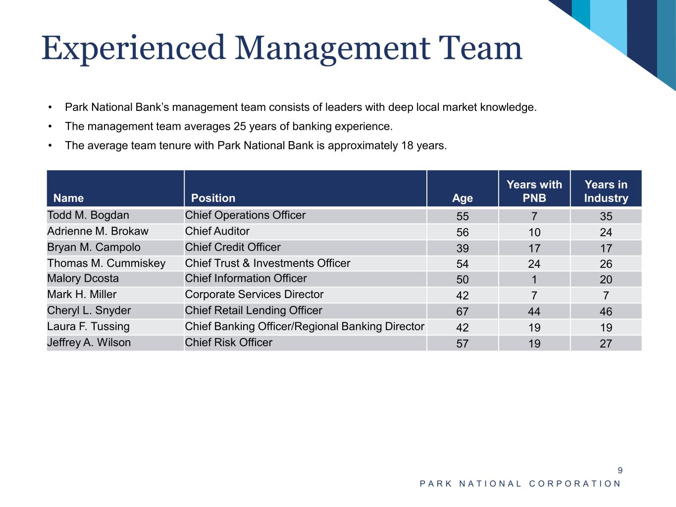 Senior Management (continued) P A R K N A T I O N A L C O R P O R A T I O N 8 Brady T. Burt – Chief Financial Officer – Age: 51 (16 years with Park) • Chief Financial Officer of Park and Park National Bank since December 2012. • Chief Accounting Officer of Park and Park National Bank from April 2007 to December 2012. • Worked at Vail Banks, Inc. in various capacities from 2002 to 2006, including as CFO. • Earned a B.S. in accounting from Miami University. • Member of Board of Directors of Federal Home Loan Bank of Cincinnati, serving on each of the Audit Committee (which he has chaired since January 1, 2021) and the Risk Committee.