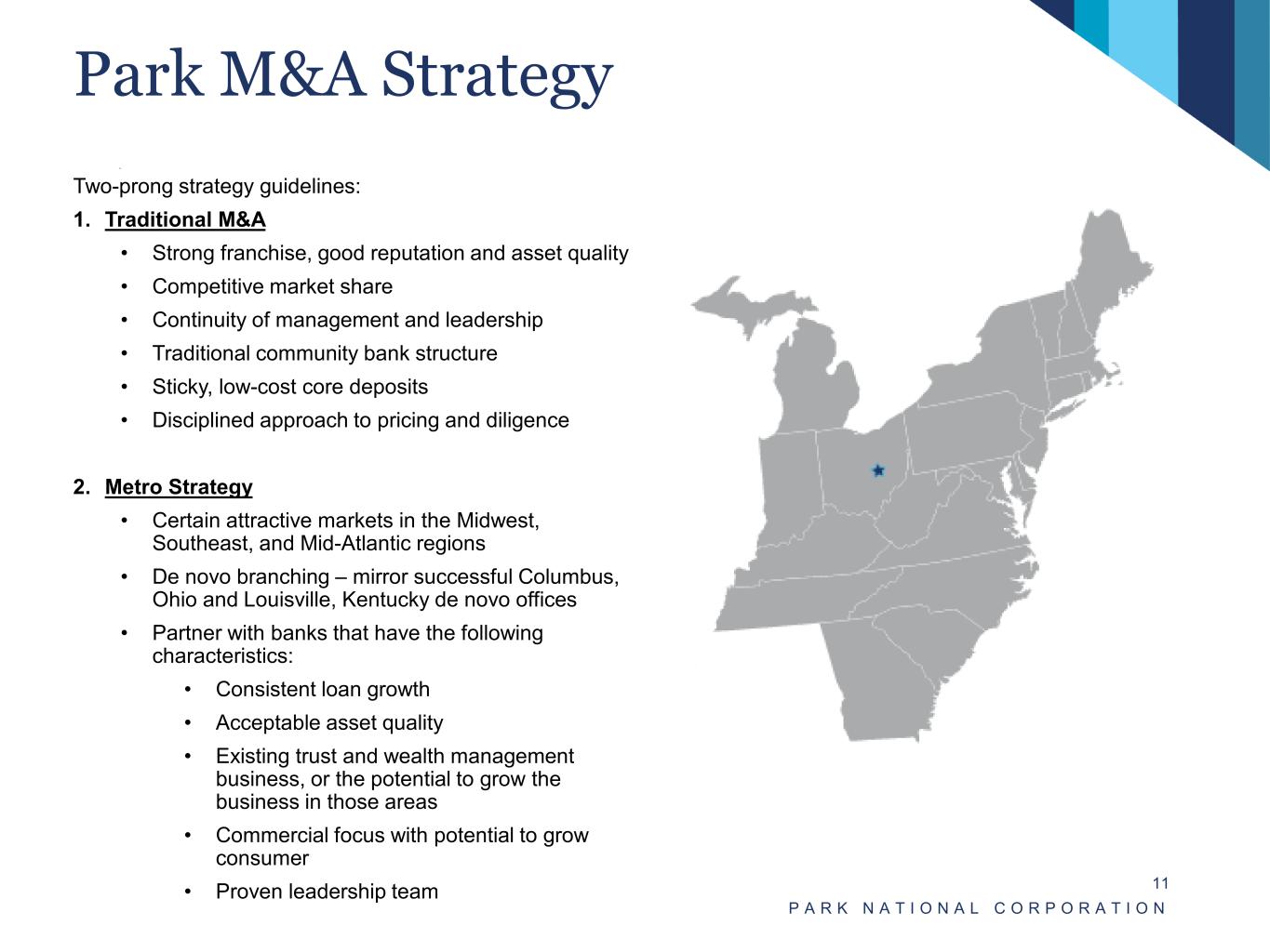 • Strong history of operating in Park’s regional bank model. • Moved to one brand, Park National Bank, in 2019 while maintaining local market leadership and advisory boards. • To better align its branch network with banking trends, Park National Bank consolidated 23 branch offices (approximately 20% of then existing) in 2020. • Proximity to other branches and few competitors in impacted markets reduced the risk of attrition. • Below average transaction volume at impacted branches. • On October 23, 2023, Park announced the consolidation of 12 branch offices, 3 relocations and 2 new market locations, all of which are in Ohio. • Park continues to analyze its remaining branch network (geography, demographics, transaction volume, etc.) to identify sensible branch optimization opportunities. • Separate presidents and advisory boards, consisting of leaders with deep local market knowledge. • Regional leadership team averages approximately 27 years of banking experience and 18 years of leadership tenure with Park. P A R K N A T I O N A L C O R P O R A T I O N 10 Community Banking Regions Name Position Age Years with PNB Years in Industry John A. Brown President - Western Ohio Region 54 32 32 Bryant W. Fox Market President - Cincinnati 35 11 11 Chris R. Hiner President - Northern Ohio Region & Director of Home Lending 40 18 18 W. Andrew Holden Market President - Louisville 49 5 27 Tim J. Ignasher Market President - Charlotte 62 7 33 John D. Kimberly President - Carolina Region 59 16 37 Patrick L. Nash President - Eastern Ohio Region 59 36 36 Laura F. Tussing President - Central Ohio Region 42 19 19 Brady E. Waltz Market President - Columbus 52 16 30