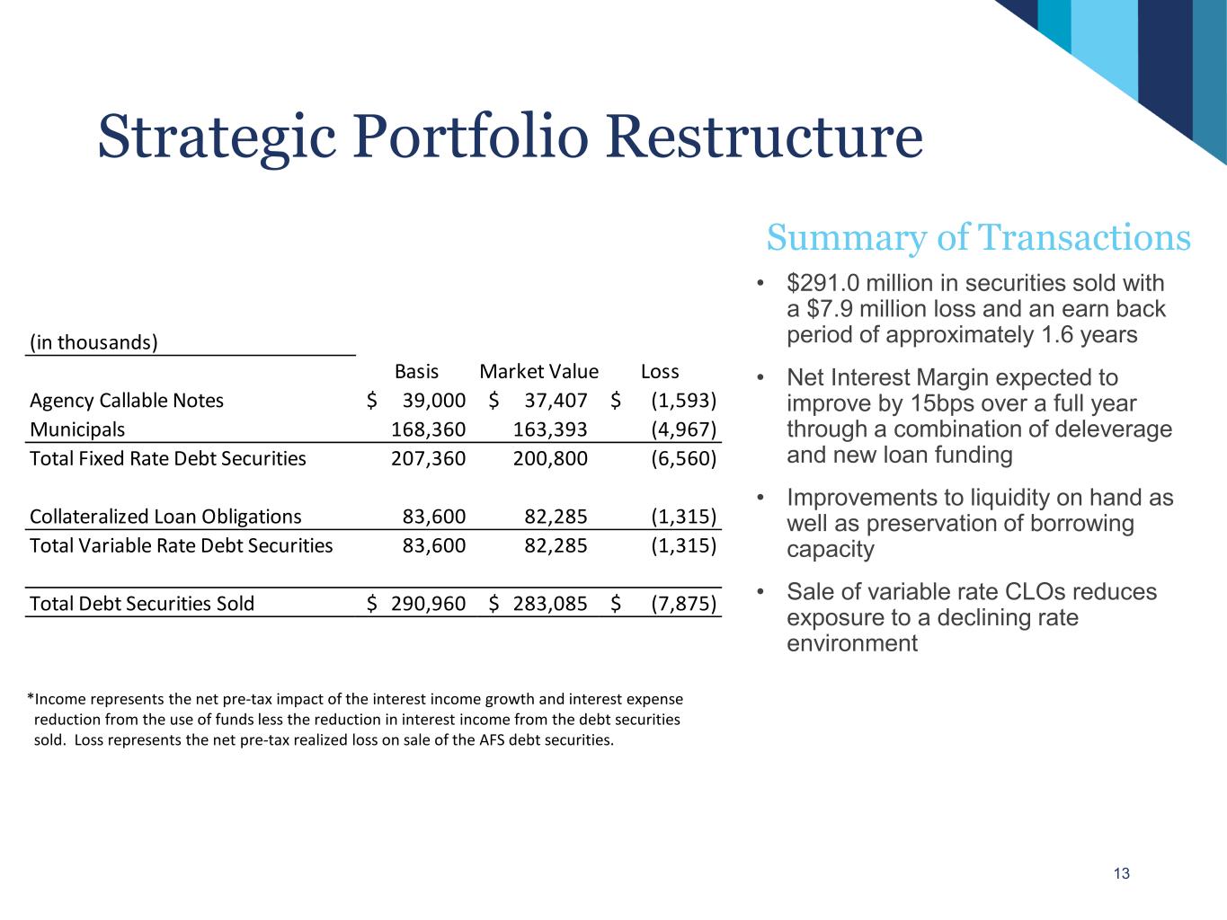 Strategic Portfolio Restructure Summary of Transactions • $291.0 million in securities sold with a $7.9 million loss and an earn back period of approximately 1.6 years • Net Interest Margin expected to improve by 15bps over a full year through a combination of deleverage and new loan funding • Improvements to liquidity on hand as well as preservation of borrowing capacity • Sale of variable rate CLOs reduces exposure to a declining rate environment 13 *Income represents the net pre-tax impact of the interest income growth and interest expense reduction from the use of funds less the reduction in interest income from the debt securities sold. Loss represents the net pre-tax realized loss on sale of the AFS debt securities. (in thousands) Basis Market Value Loss Agency Callable Notes 39,000$ 37,407$ (1,593)$ Municipals 168,360 163,393 (4,967) Total Fixed Rate Debt Securities 207,360 200,800 (6,560) Collateralized Loan Obligations 83,600 82,285 (1,315) Total Variable Rate Debt Securities 83,600 82,285 (1,315) Total Debt Securities Sold 290,960$ 283,085$ (7,875)$