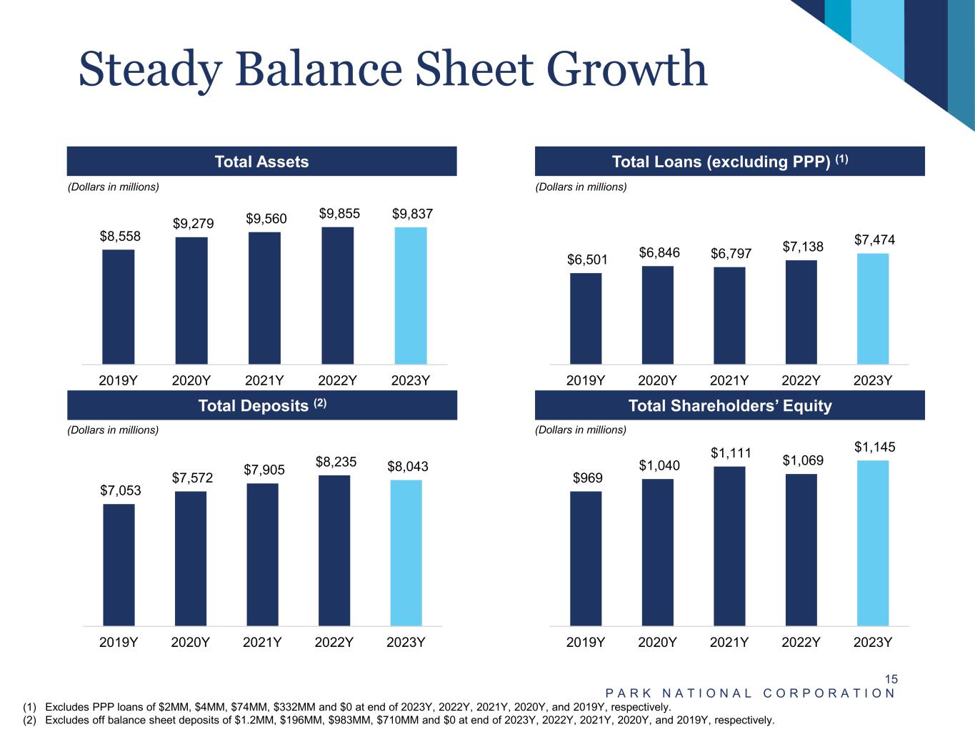 2023 Fourth Quarter Highlights P A R K N A T I O N A L C O R P O R A T I O N 14 • Park’s Consolidated Capital Ratios at December 31, 2023: – Total Shareholders’ Equity to Total Assets of 11.64% – Tangible Common Equity to Tangible Assets of 10.14%(1) – Leverage Ratio of 10.74% – Total Risk-Based Capital Ratio of 16.19% • Book value per common share grew from $65.74 at December 31, 2022 to $71.06 at December 31, 2023. • Tangible book value per common share(1) grew from $55.56 at December 31, 2022 to $60.87 at December 31, 2023. • Net income of $24.5 million for Q4 2023, compared to $33.1 million for Q4 2022. Q4 2023 included losses of $7.9 million on the sale of debt securities. • Pre-tax, pre-provision net income (“PTPP”)(1) of $31.5 million for Q4 2023, compared to $40.7 million and $44.2 million during Q2 2023 and Q3 2023, respectively. PTPP net income was $43.3 million in Q4 2022. Provision for credit losses for Q4 2023 of $1.8 million compared to a provision for credit losses of $3.0 million for Q4 2022. • Loans grew from $7.14 billion at December 31, 2022 to $7.48 billion at December 31, 2023. • Loan growth during Q4 2023 was $126.5 million, or 6.83% annualized. • Commercial loan growth during Q4 2023 was $110.2 million or 11.21% annualized. • ACL / Loans decreased to 1.12% at December 31, 2023, compared to 1.20% at December 31, 2022. Park Performance Summary (1) (1) See “Reconciliation of Non-GAAP Financial Measures” shown on pages 35 and 36.