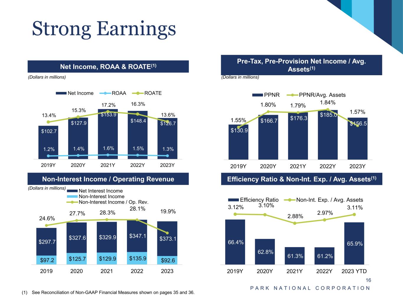 Steady Balance Sheet Growth P A R K N A T I O N A L C O R P O R A T I O N 15 Total Assets Total Loans (excluding PPP) (1) Total Deposits (2) Total Shareholders’ Equity (Dollars in millions) (Dollars in millions) (Dollars in millions) (Dollars in millions) (1) Excludes PPP loans of $2MM, $4MM, $74MM, $332MM and $0 at end of 2023Y, 2022Y, 2021Y, 2020Y, and 2019Y, respectively. (2) Excludes off balance sheet deposits of $1.2MM, $196MM, $983MM, $710MM and $0 at end of 2023Y, 2022Y, 2021Y, 2020Y, and 2019Y, respectively. $8,558 $9,279 $9,560 $9,855 $9,837 2019Y 2020Y 2021Y 2022Y 2023Y $6,501 $6,846 $6,797 $7,138 $7,474 2019Y 2020Y 2021Y 2022Y 2023Y $7,053 $7,572 $7,905 $8,235 $8,043 2019Y 2020Y 2021Y 2022Y 2023Y $969 $1,040 $1,111 $1,069 $1,145 2019Y 2020Y 2021Y 2022Y 2023Y