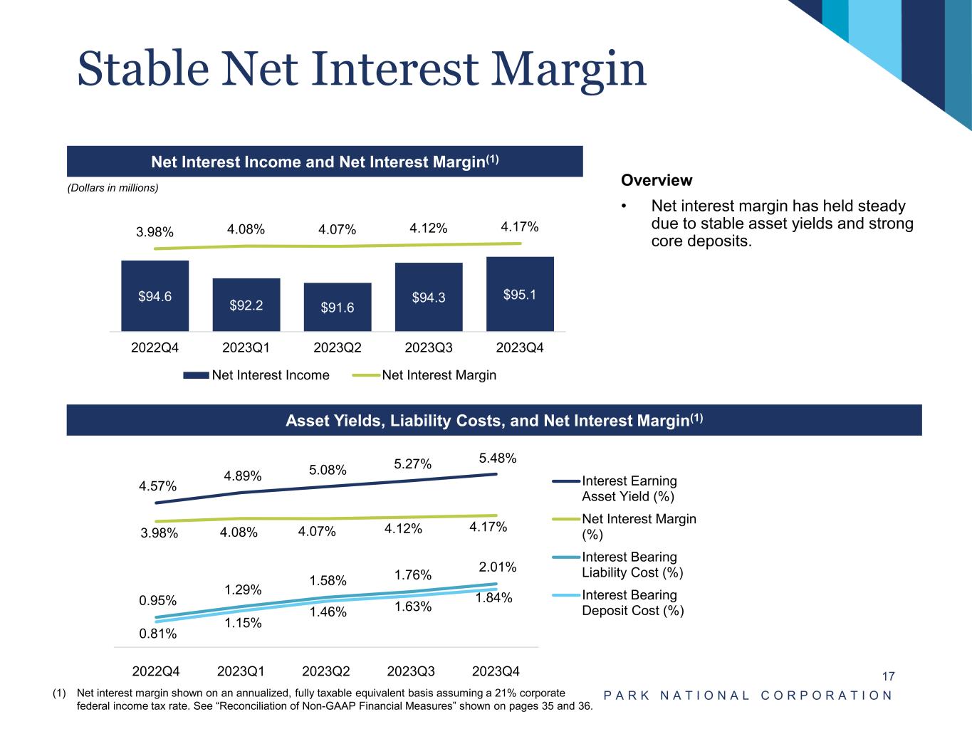 Efficiency Ratio & Non-Int. Exp. / Avg. Assets(1) Strong Earnings P A R K N A T I O N A L C O R P O R A T I O N 16 (Dollars in millions) Net Income, ROAA & ROATE(1) Non-Interest Income / Operating Revenue Pre-Tax, Pre-Provision Net Income / Avg. Assets(1) (1) See Reconciliation of Non-GAAP Financial Measures shown on pages 35 and 36. (Dollars in millions) (Dollars in millions) $153.9$153.9 $102.7 $127.9 $153.9 $148.4 $126.7 1.2% 1.4% 1.6% 1.5% 1.3% 13.4% 15.3% 17.2% 16.3% 13.6% – $20.0 $40.0 $60.0 $80.0 $100.0 $120.0 $140.0 $160.0 2019Y 2020Y 2021Y 2022Y 2023Y – 4.0% 8.0% 12.0% 16.0% 20.0% Net Income ROAA ROATE $130.9 $166.7 $176.3 $185.0 $156.5 1.55% 1.80% 1.79% 1.84% 1.57% – $20 .0 $40 .0 $60 .0 $80 .0 $10 0.0 $12 0.0 $14 0.0 $16 0.0 $18 0.0 $20 0.0 1.0 0% 1.1 0% 1.2 0% 1.3 0% 1.4 0% 1.5 0% 1.6 0% 1.7 0% 1.8 0% 1.9 0% 2019Y 2020Y 2021Y 2022Y 2023Y PPNR PPNR/Avg. Assets $97.2 $125.7 $129.9 $135.9 $92.6 $297.7 $327.6 $329.9 $347.1 $373.1 24.6% 27.7% 28.3% 28.1% 19.9% 2019 2020 2021 2022 2023 Net Interest Income Non-Interest Income Non-Interest Income / Op. Rev. 66.4% 62.8% 61.3% 61.2% 65.9% 3.12% 3.10% 2.88% 2.97% 3.11% 2019Y 2020Y 2021Y 2022Y 2023 YTD Efficiency Ratio Non-Int. Exp. / Avg. Assets