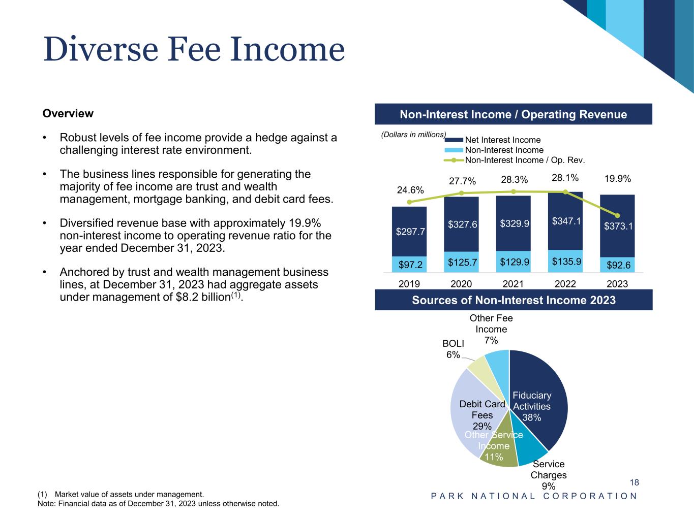 Stable Net Interest Margin P A R K N A T I O N A L C O R P O R A T I O N 17 Overview • Net interest margin has held steady due to stable asset yields and strong core deposits. Net Interest Income and Net Interest Margin(1) Asset Yields, Liability Costs, and Net Interest Margin(1) (Dollars in millions) (1) Net interest margin shown on an annualized, fully taxable equivalent basis assuming a 21% corporate federal income tax rate. See “Reconciliation of Non-GAAP Financial Measures” shown on pages 35 and 36. $94.6 $92.2 $91.6 $94.3 $95.1 3.98% 4.08% 4.07% 4.12% 4.17% 2022Q4 2023Q1 2023Q2 2023Q3 2023Q4 Net Interest Income Net Interest Margin 4.57% 4.89% 5.08% 5.27% 5.48% 3.98% 4.08% 4.07% 4.12% 4.17% 0.95% 1.29% 1.58% 1.76% 2.01% 0.81% 1.15% 1.46% 1.63% 1.84% 2022Q4 2023Q1 2023Q2 2023Q3 2023Q4 Interest Earning Asset Yield (%) Net Interest Margin (%) Interest Bearing Liability Cost (%) Interest Bearing Deposit Cost (%)
