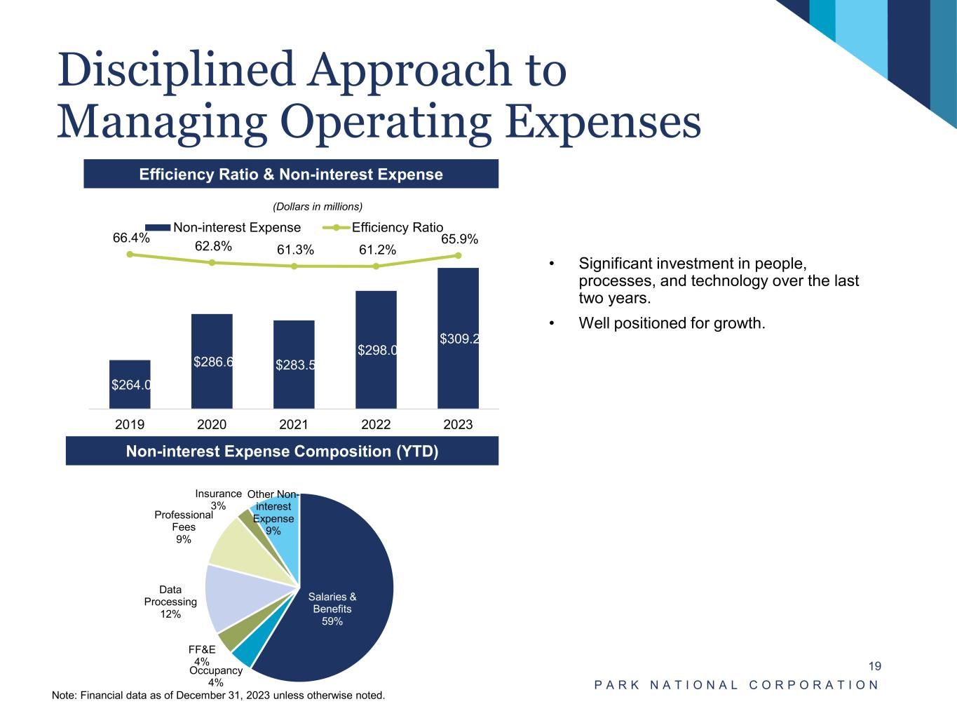 Diverse Fee Income P A R K N A T I O N A L C O R P O R A T I O N 18 Overview • Robust levels of fee income provide a hedge against a challenging interest rate environment. • The business lines responsible for generating the majority of fee income are trust and wealth management, mortgage banking, and debit card fees. • Diversified revenue base with approximately 19.9% non-interest income to operating revenue ratio for the year ended December 31, 2023. • Anchored by trust and wealth management business lines, at December 31, 2023 had aggregate assets under management of $8.2 billion(1). Sources of Non-Interest Income 2023 Non-Interest Income / Operating Revenue (1) Market value of assets under management. Note: Financial data as of December 31, 2023 unless otherwise noted. (Dollars in millions) Fiduciary Activities 38% Service Charges 9% Other Service Income 11% Debit Card Fees 29% BOLI 6% Other Fee Income 7% $97.2 $125.7 $129.9 $135.9 $92.6 $297.7 $327.6 $329.9 $347.1 $373.1 24.6% 27.7% 28.3% 28.1% 19.9% 2019 2020 2021 2022 2023 Net Interest Income Non-Interest Income Non-Interest Income / Op. Rev.