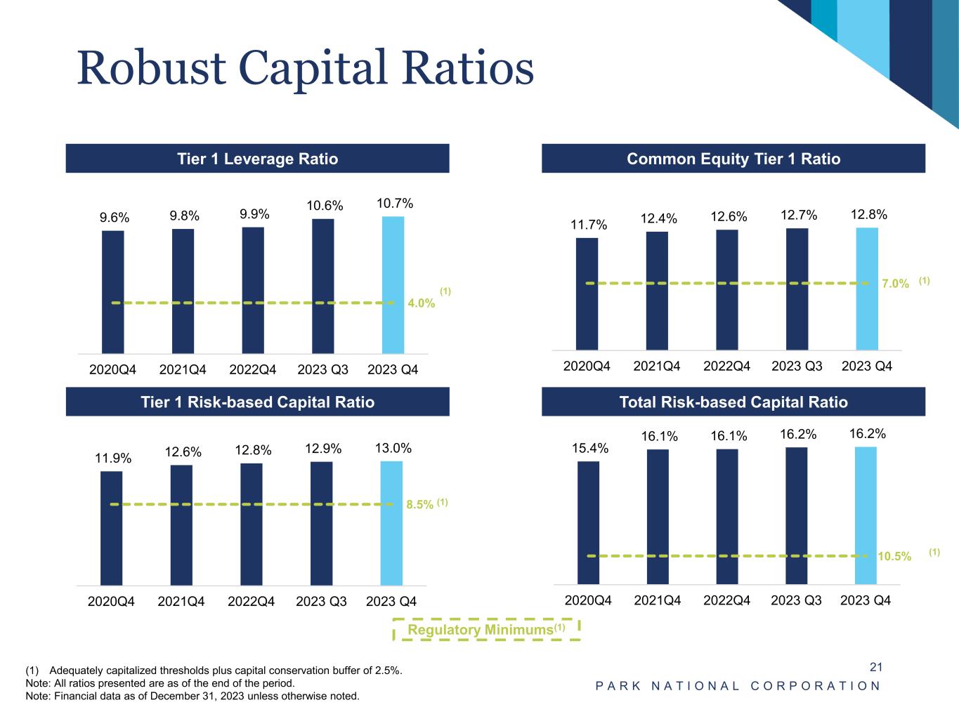High Quality Capital Structure 99% of Park’s Tier 1 Capital is Common Equity P A R K N A T I O N A L C O R P O R A T I O N 20 Common Equity Tier 1 Trust Preferred Receives full Tier 1 Capital treatment Subordinated Notes and Allowance for Credit Losses Tier 1 Capital $1,060.6 million Tier 2 Capital $263.0 million Note: Financial data as of December 31, 2023 unless otherwise noted. ACL $88.9 Subdebt $174.1 Trust Preferred $15.0 Common Equity Tier 1 $1,045.6 1 Regulatory Capital at December 31, 2023 (Dollars in millions)
