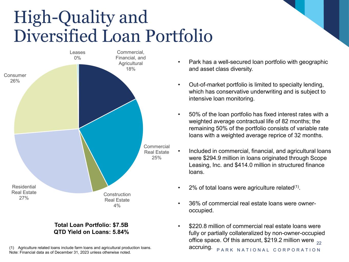 Robust Capital Ratios P A R K N A T I O N A L C O R P O R A T I O N 21(1) Adequately capitalized thresholds plus capital conservation buffer of 2.5%. Note: All ratios presented are as of the end of the period. Note: Financial data as of December 31, 2023 unless otherwise noted. Tier 1 Leverage Ratio Common Equity Tier 1 Ratio Tier 1 Risk-based Capital Ratio Total Risk-based Capital Ratio Regulatory Minimums(1) (1) (1) (1) 9.6% 9.8% 9.9% 10.6% 10.7% 4.0% – 2.0% 4.0% 6.0% 8.0% 10.0% 12.0% 2020Q4 2021Q4 2022Q4 2023 Q3 2023 Q4 11.7% 12.4% 12.6% 12.7% 12.8% 7.0% – 2.0% 4.0% 6.0% 8.0% 10.0% 12.0% 14.0% 16.0% 2020Q4 2021Q4 2022Q4 2023 Q3 2023 Q4 (1) 11.9% 12.6% 12.8% 12.9% 13.0% 8.5% – 2.0% 4.0% 6.0% 8.0% 10.0% 12.0% 14.0% 16.0% 2020Q4 2021Q4 2022Q4 2023 Q3 2023 Q4 15.4% 16.1% 16.1% 16.2% 16.2% 10.5% 9.0% 10.0% 11.0% 12.0% 13.0% 14.0% 15.0% 16.0% 17.0% 2020Q4 2021Q4 2022Q4 2023 Q3 2023 Q4