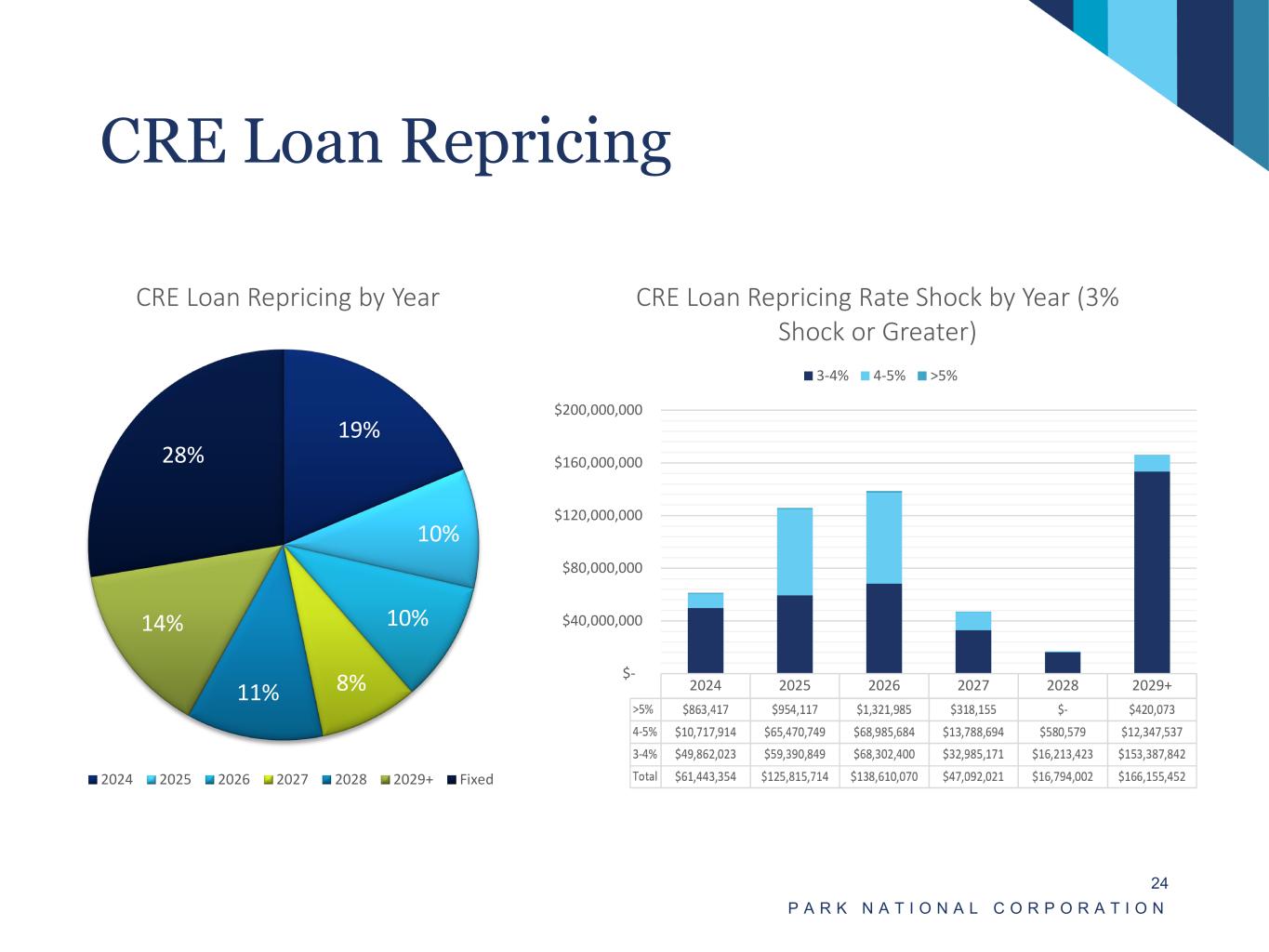 Commercial Loan Repricing P A R K N A T I O N A L C O R P O R A T I O N 23 2024 2025 2026 2027 2028 2029+ >5% $1,487,770 $2,327,487 $5,011,946 $724,358 $140,887 $2,604,830 4-5% $32,647,95 $118,366,8 $116,014,2 $21,318,41 $1,384,765 $14,515,04 3-4% $65,880,42 $77,260,19 $91,099,51 $44,642,28 $22,111,07 $198,093,2 $- $50,000,000 $100,000,000 $150,000,000 $200,000,000 $250,000,000 Commercial Loan Repricing Rate Shock by Year (3% Shock or Greater) 3-4% 4-5% >5% 33% 7% 7% 6% 8% 9% 30% Commercial Loan Repricing by Year 2024 2025 2026 2027 2028 2029+ Fixed