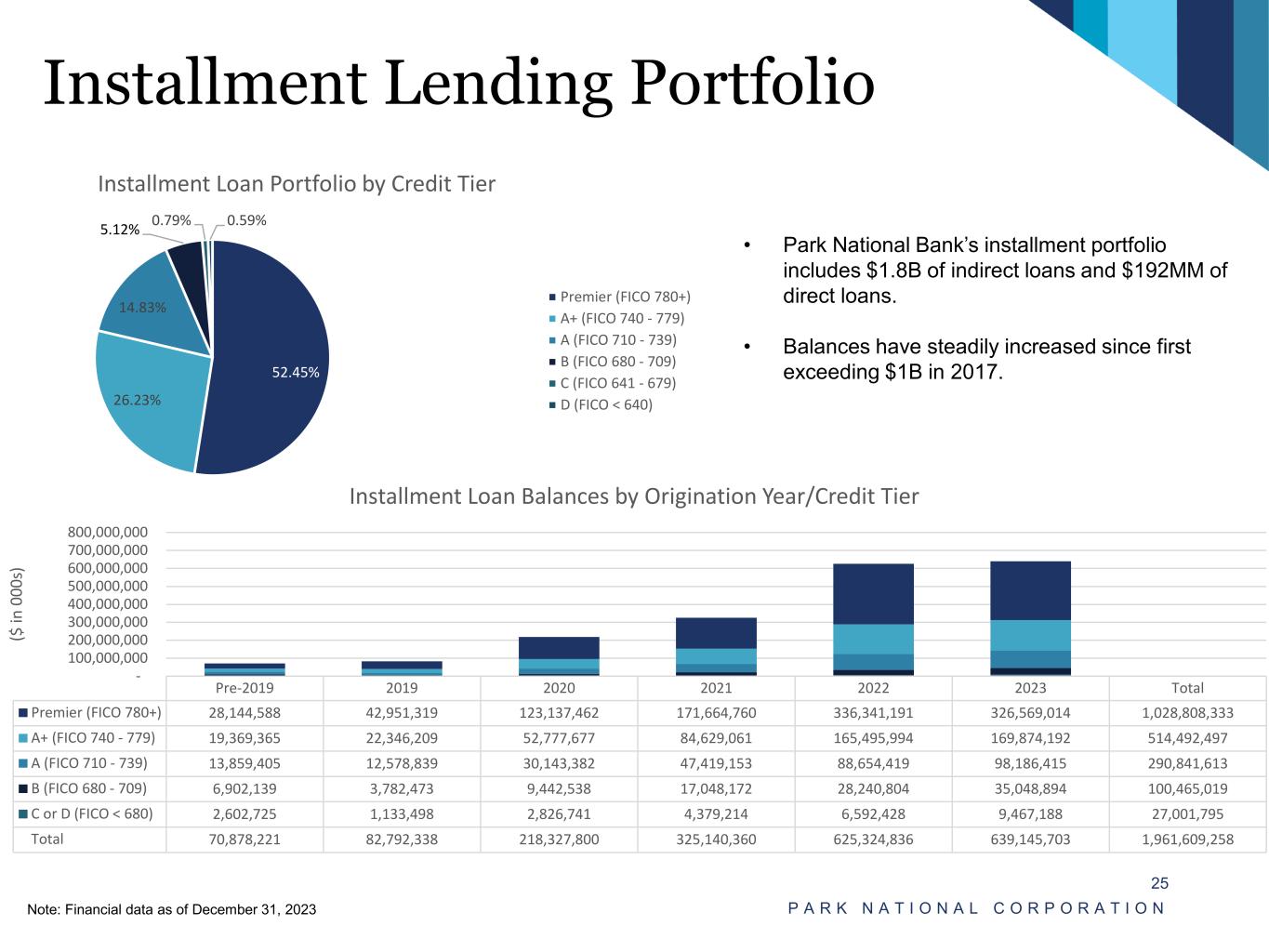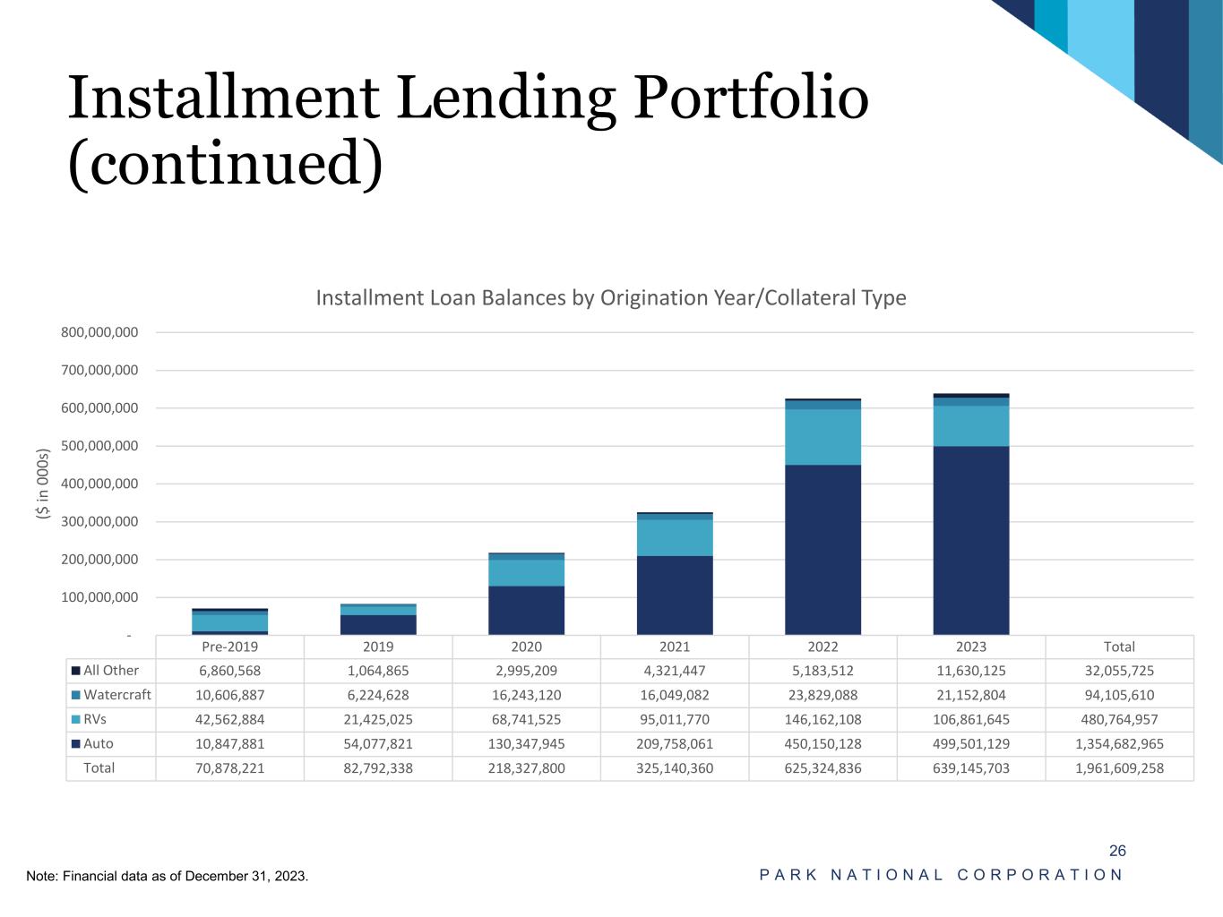 Installment Lending Portfolio P A R K N A T I O N A L C O R P O R A T I O N 25 Note: Financial data as of December 31, 2023 • Park National Bank’s installment portfolio includes $1.8B of indirect loans and $192MM of direct loans. • Balances have steadily increased since first exceeding $1B in 2017. Pre-2019 2019 2020 2021 2022 2023 Total Premier (FICO 780+) 28,144,588 42,951,319 123,137,462 171,664,760 336,341,191 326,569,014 1,028,808,333 A+ (FICO 740 - 779) 19,369,365 22,346,209 52,777,677 84,629,061 165,495,994 169,874,192 514,492,497 A (FICO 710 - 739) 13,859,405 12,578,839 30,143,382 47,419,153 88,654,419 98,186,415 290,841,613 B (FICO 680 - 709) 6,902,139 3,782,473 9,442,538 17,048,172 28,240,804 35,048,894 100,465,019 C or D (FICO < 680) 2,602,725 1,133,498 2,826,741 4,379,214 6,592,428 9,467,188 27,001,795 Total 70,878,221 82,792,338 218,327,800 325,140,360 625,324,836 639,145,703 1,961,609,258 - 100,000,000 200,000,000 300,000,000 400,000,000 500,000,000 600,000,000 700,000,000 800,000,000 ($ in 0 00 s) Installment Loan Balances by Origination Year/Credit Tier 52.45% 26.23% 14.83% 5.12% 0.79% 0.59% Installment Loan Portfolio by Credit Tier Premier (FICO 780+) A+ (FICO 740 - 779) A (FICO 710 - 739) B (FICO 680 - 709) C (FICO 641 - 679) D (FICO < 640)