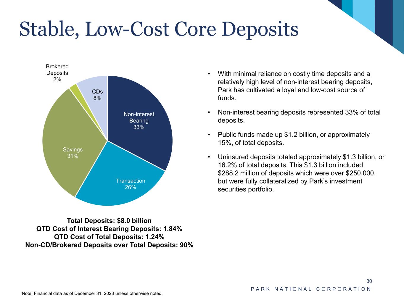 Stable Asset Quality P A R K N A T I O N A L C O R P O R A T I O N 29 Net Charge-Offs / Average Loans Classified Loans(2) / Tier 1 Capital + ACL Overview • Conservative underwriting and strong asset quality. • Of the $60.3 million in nonaccrual loans, $39.0 million, or about 65%, were current with contractual payments at December 31, 2023. NPAs / Total Assets (1) (1) NPAs exclude accruing troubled debt restructuring loans and loans 90+ days past due. (2) Classified loans are defined as those rated substandard or individually evaluated, excluding accruing purchase credit deteriorated (PCD) loans associated with the acquisitions of NewDominion Bank and CAB Financial Corporation. 1.14% 1.31% 0.80% 0.82% 0.62% 2019Q4 2020Q4 2021Q4 2022Q4 2023Q4 0.02% (0.24%) (0.05%) 0.03% 0.07% (0.70%) (0.20%) 0.30% 0.80% 1.30% 1.80% 2019Y 2020Y 2021Y 2022Y 2023Y 8.94% 11.25% 7.27% 7.27% 4.25% 2019Q4 2020Q4 2021Q4 2022Q4 2023Q4