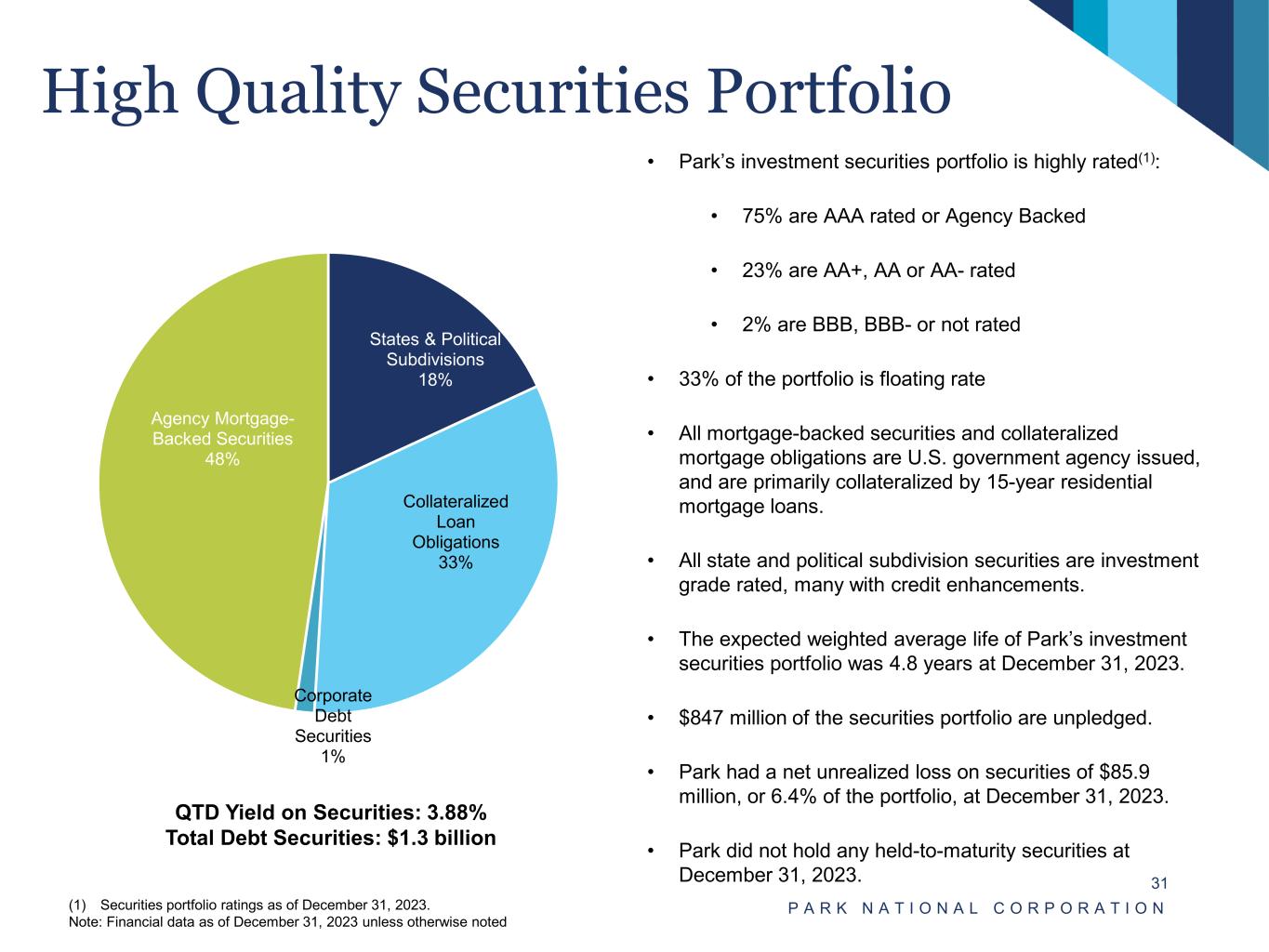 Stable, Low-Cost Core Deposits P A R K N A T I O N A L C O R P O R A T I O N 30 • With minimal reliance on costly time deposits and a relatively high level of non-interest bearing deposits, Park has cultivated a loyal and low-cost source of funds. • Non-interest bearing deposits represented 33% of total deposits. • Public funds made up $1.2 billion, or approximately 15%, of total deposits. • Uninsured deposits totaled approximately $1.3 billion, or 16.2% of total deposits. This $1.3 billion included $288.2 million of deposits which were over $250,000, but were fully collateralized by Park’s investment securities portfolio. Total Deposits: $8.0 billion QTD Cost of Interest Bearing Deposits: 1.84% QTD Cost of Total Deposits: 1.24% Non-CD/Brokered Deposits over Total Deposits: 90% Note: Financial data as of December 31, 2023 unless otherwise noted. Non-interest Bearing 33% Transaction 26% Savings 31% Brokered Deposits 2% CDs 8%