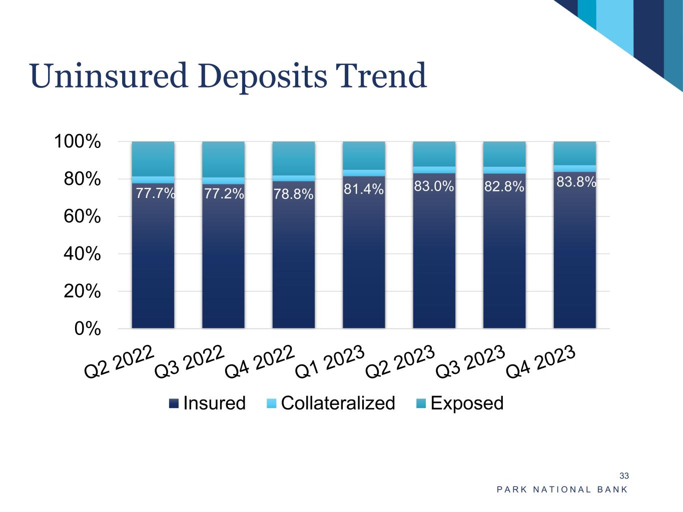P A R K N A T I O N A L B A N K 33 Uninsured Deposits Trend 77.7% 77.2% 78.8% 81.4% 83.0% 82.8% 83.8% 0% 20% 40% 60% 80% 100% Insured Collateralized Exposed