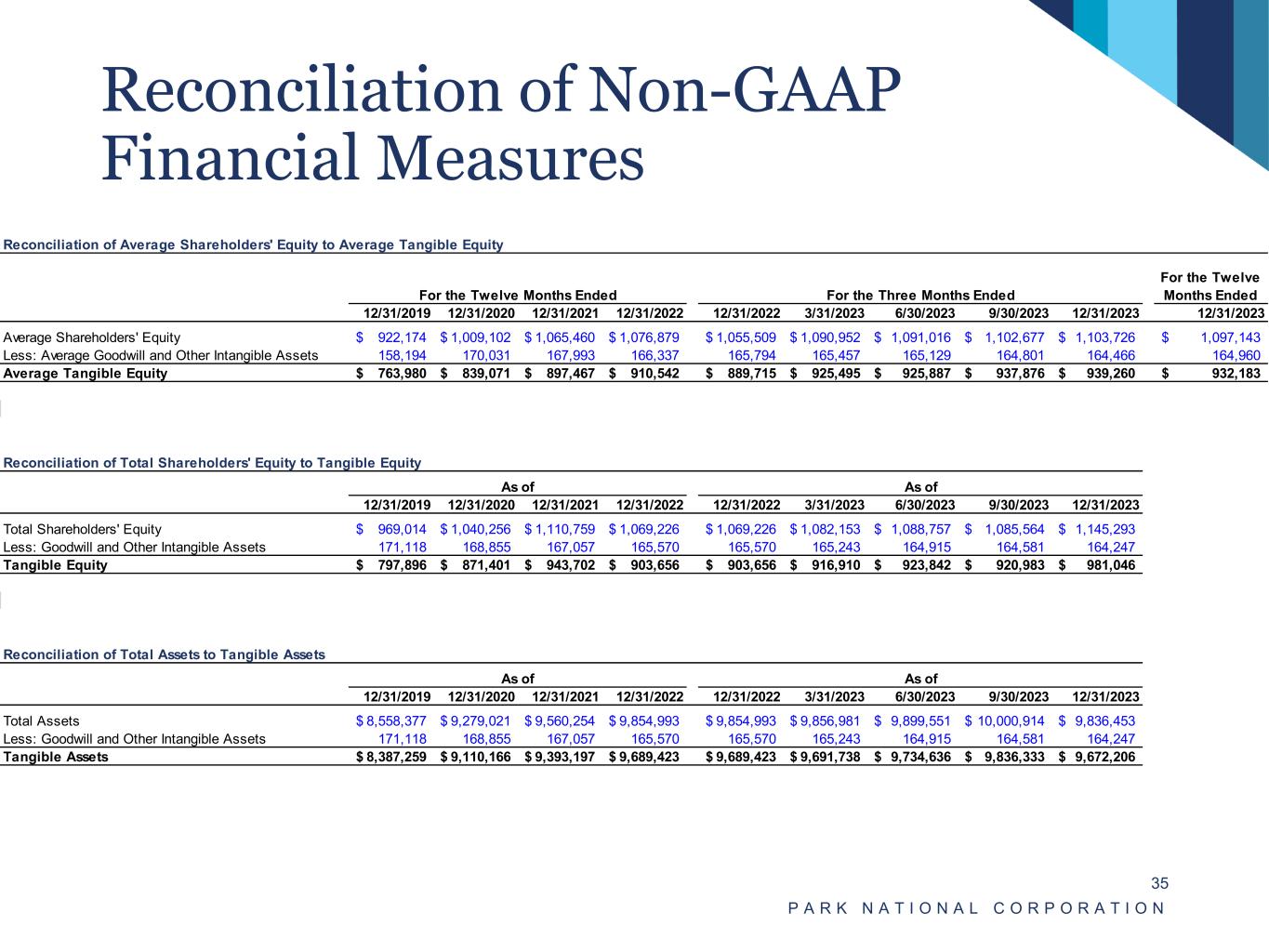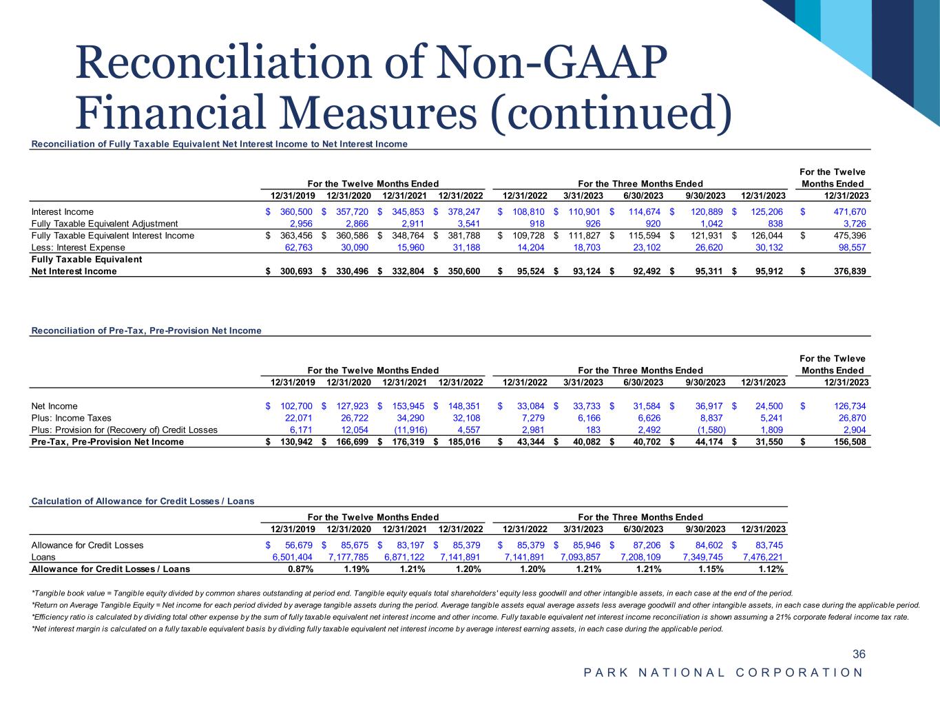 Reconciliation of Non-GAAP Financial Measures P A R K N A T I O N A L C O R P O R A T I O N 35 Reconciliation of Average Shareholders' Equity to Average Tangible Equity For the Twelve Months Ended For the Three Months Ended For the Twelve Months Ended 12/31/2019 12/31/2020 12/31/2021 12/31/2022 12/31/2022 3/31/2023 6/30/2023 9/30/2023 12/31/2023 12/31/2023 Average Shareholders' Equity 922,174$ 1,009,102$ 1,065,460$ 1,076,879$ 1,055,509$ 1,090,952$ 1,091,016$ 1,102,677$ 1,103,726$ 1,097,143$ Less: Average Goodwill and Other Intangible Assets 158,194 170,031 167,993 166,337 165,794 165,457 165,129 164,801 164,466 164,960 Average Tangible Equity 763,980$ 839,071$ 897,467$ 910,542$ 889,715$ 925,495$ 925,887$ 937,876$ 939,260$ 932,183$ Reconciliation of Total Shareholders' Equity to Tangible Equity As of As of 12/31/2019 12/31/2020 12/31/2021 12/31/2022 12/31/2022 3/31/2023 6/30/2023 9/30/2023 12/31/2023 Total Shareholders' Equity 969,014$ 1,040,256$ 1,110,759$ 1,069,226$ 1,069,226$ 1,082,153$ 1,088,757$ 1,085,564$ 1,145,293$ Less: Goodwill and Other Intangible Assets 171,118 168,855 167,057 165,570 165,570 165,243 164,915 164,581 164,247 Tangible Equity 797,896$ 871,401$ 943,702$ 903,656$ 903,656$ 916,910$ 923,842$ 920,983$ 981,046$ Reconciliation of Total Assets to Tangible Assets As of As of 12/31/2019 12/31/2020 12/31/2021 12/31/2022 12/31/2022 3/31/2023 6/30/2023 9/30/2023 12/31/2023 Total Assets 8,558,377$ 9,279,021$ 9,560,254$ 9,854,993$ 9,854,993$ 9,856,981$ 9,899,551$ 10,000,914$ 9,836,453$ Less: Goodwill and Other Intangible Assets 171,118 168,855 167,057 165,570 165,570 165,243 164,915 164,581 164,247 Tangible Assets 8,387,259$ 9,110,166$ 9,393,197$ 9,689,423$ 9,689,423$ 9,691,738$ 9,734,636$ 9,836,333$ 9,672,206$