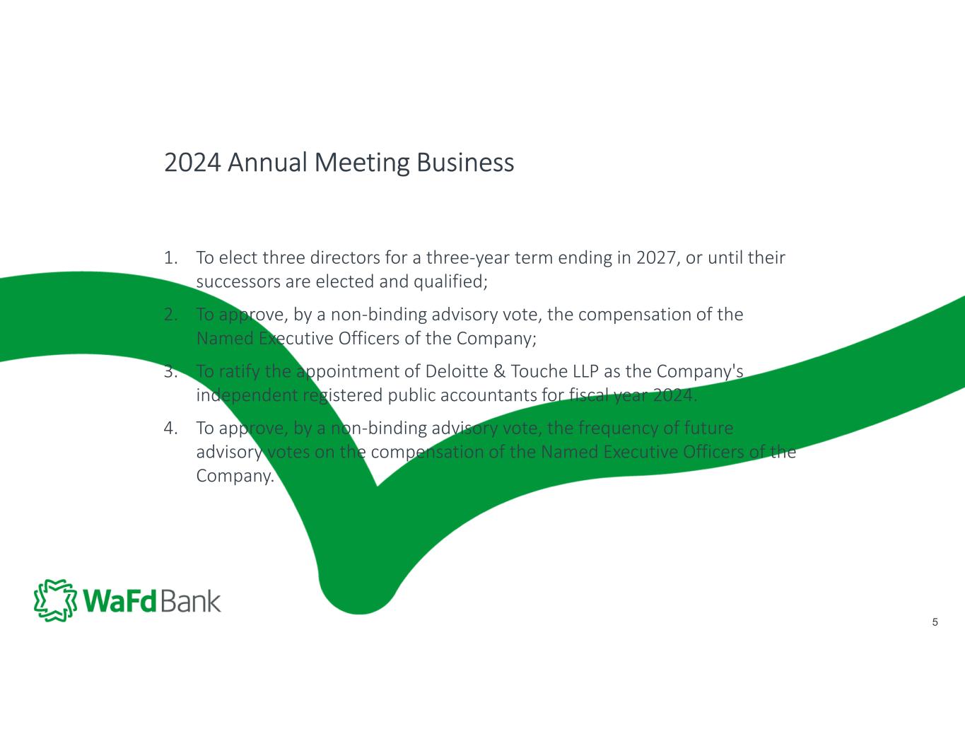 4 The annual report and proxy are at www.wafdbank.com or request a physical copy by emailing info@wafd.com . Anyone who wishes to revoke their proxy or who hasn’t voted must click on the “Vote Now” screen during this meeting prior to closing of the polls. Have your 16-digit control number handy. If you have already voted, you do not need to vote again. There are approximately 64.2 million shares entitled to vote at this meeting. Notice was mailed to each stockholder of record as of December 11, 2023; this meeting is therefore lawfully convened. 2024 Annual Meeting Business 4