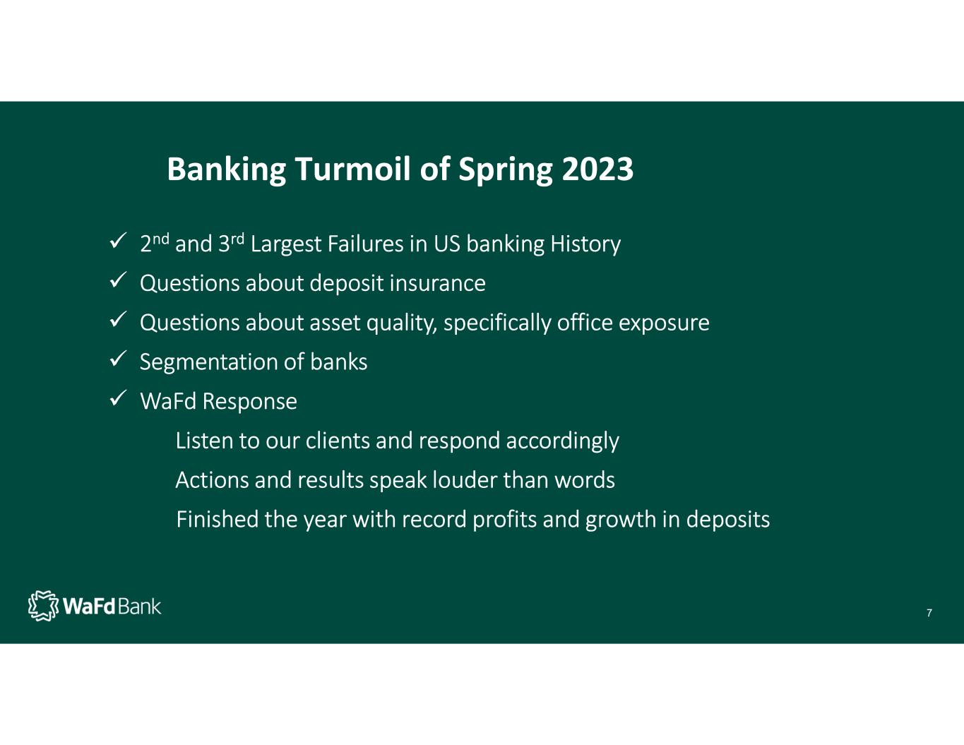 Banking Turmoil of Spring 2023 2nd and 3rd Largest Failures in US banking History Questions about deposit insurance Questions about asset quality, specifically office exposure Segmentation of banks WaFd Response Listen to our clients and respond accordingly Actions and results speak louder than words Finished the year with record profits and growth in deposits 7