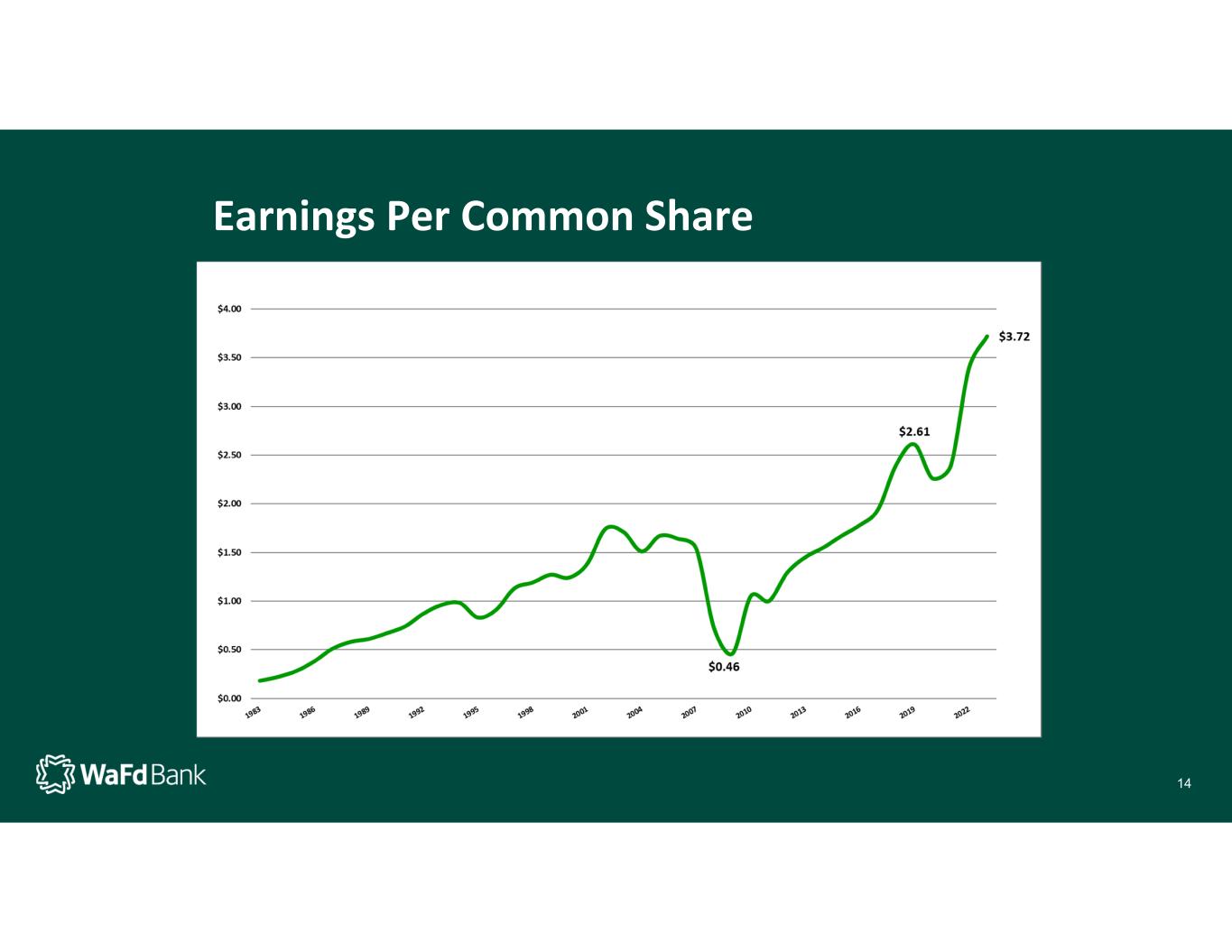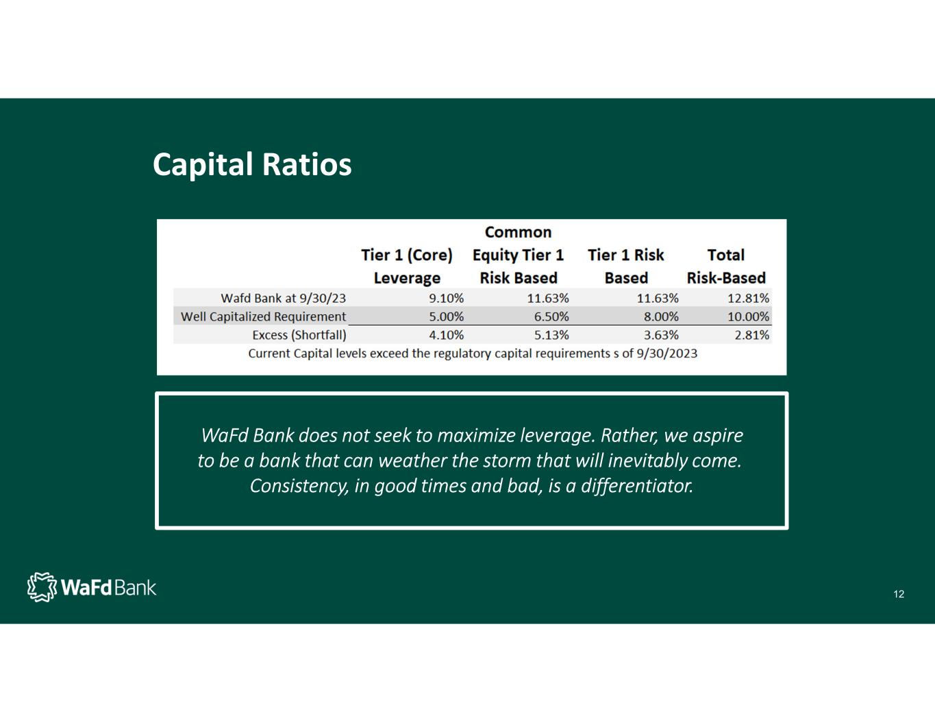 Capital Ratios WaFd Bank does not seek to maximize leverage. Rather, we aspire to be a bank that can weather the storm that will inevitably come. Consistency, in good times and bad, is a differentiator. 12