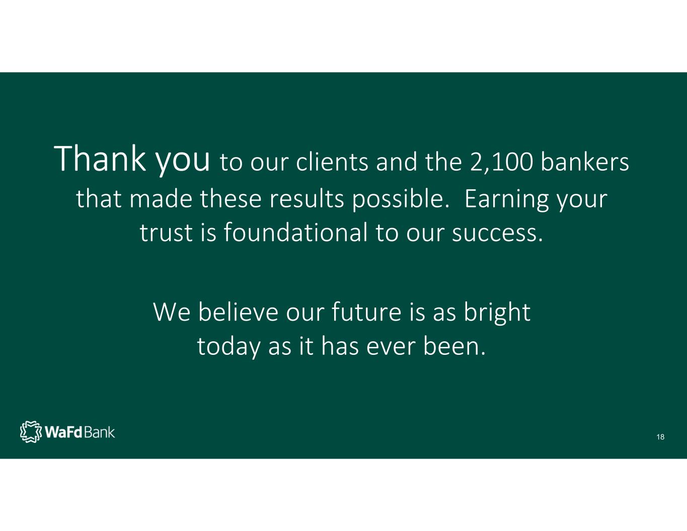 Thank you to our clients and the 2,100 bankers that made these results possible. Earning your trust is foundational to our success. We believe our future is as bright today as it has ever been. 18