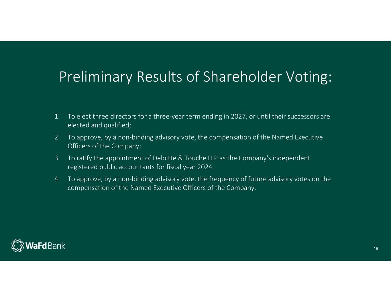 The Annual Meeting of Shareholders of WaFd, Inc. (the "Company") was held on February 13, 2024. The four items voted upon by shareholders included 1) the election of three directors for a three-year term; 2) the approval of a non-binding, advisory vote on the compensation of WaFd, Inc. named executive officers; 3) the ratification of the appointment of Deloitte & Touche, LLP as the independent registered public accountants for fiscal 2024; and 4) the approval of a non-binding advisory vote on the frequency of future advisory votes on the compensation of the named executive officers of the Company. The results of the voting were as follows: